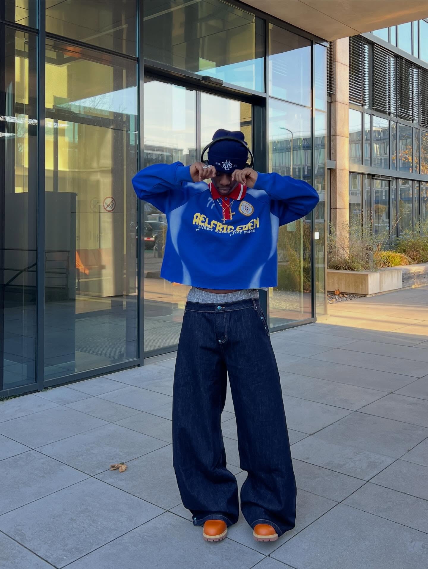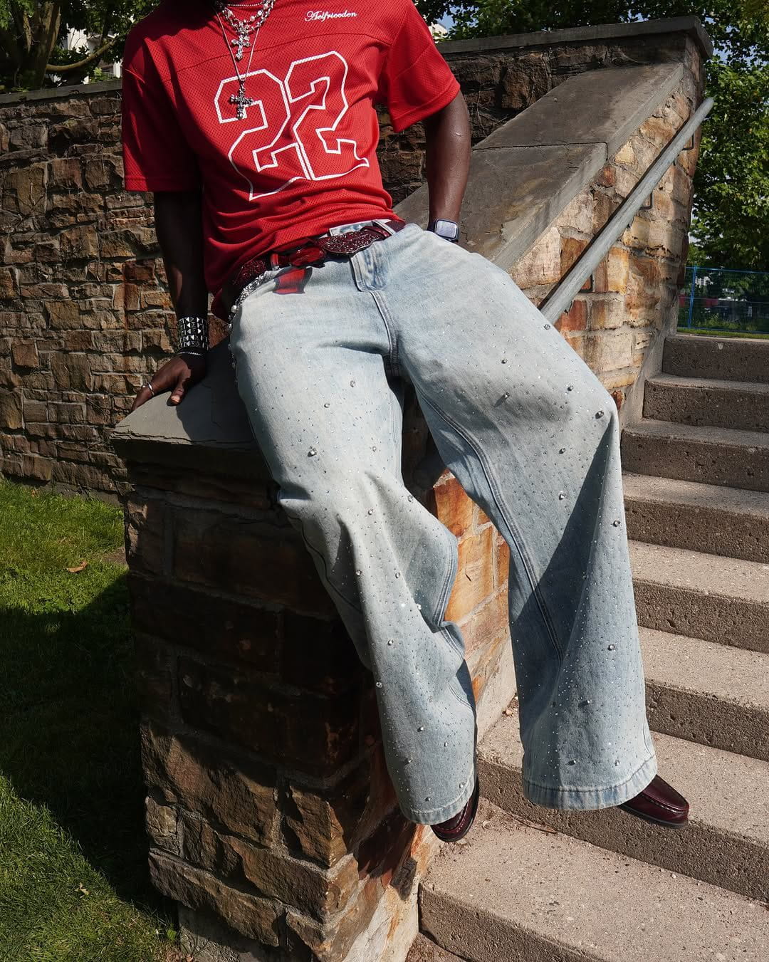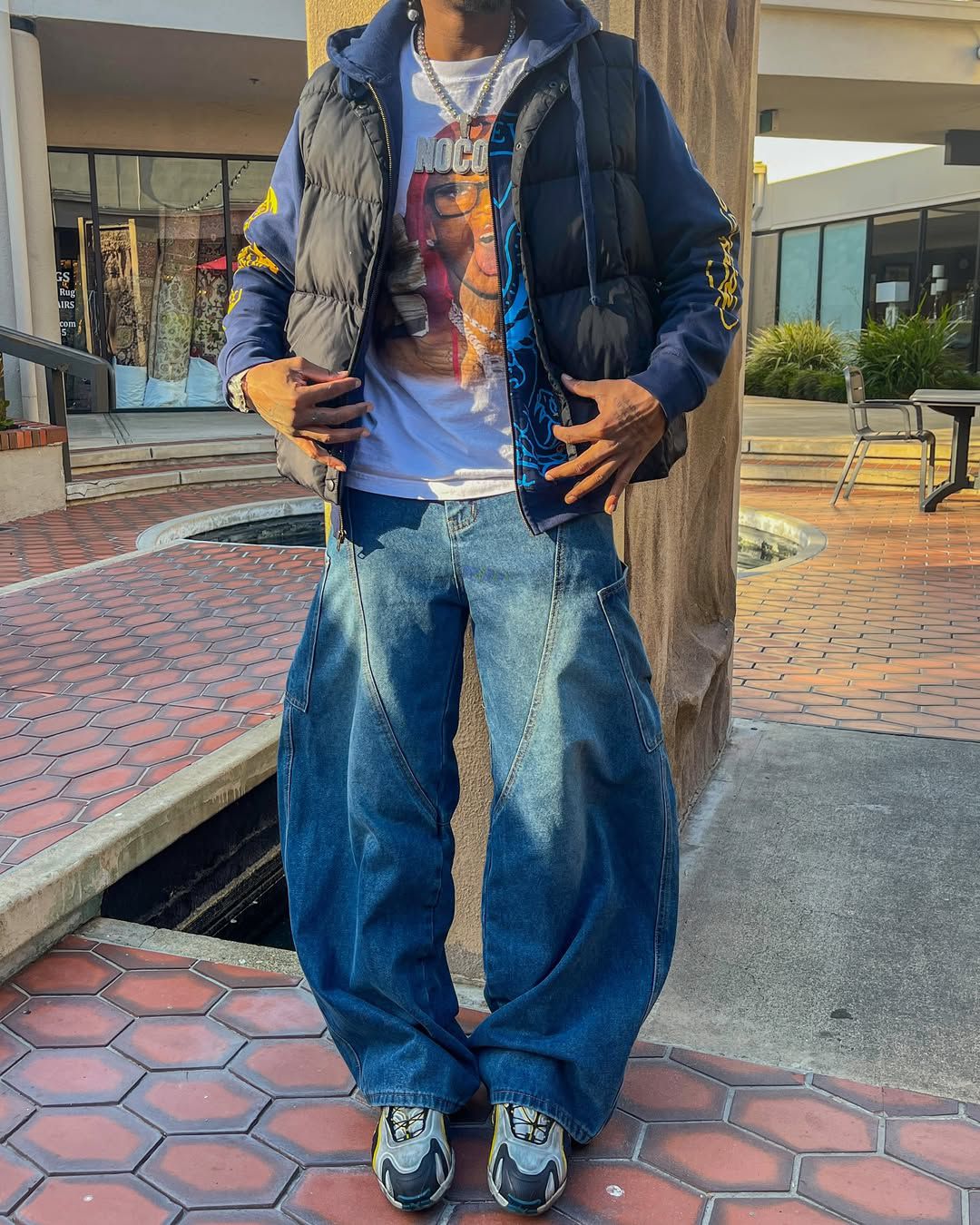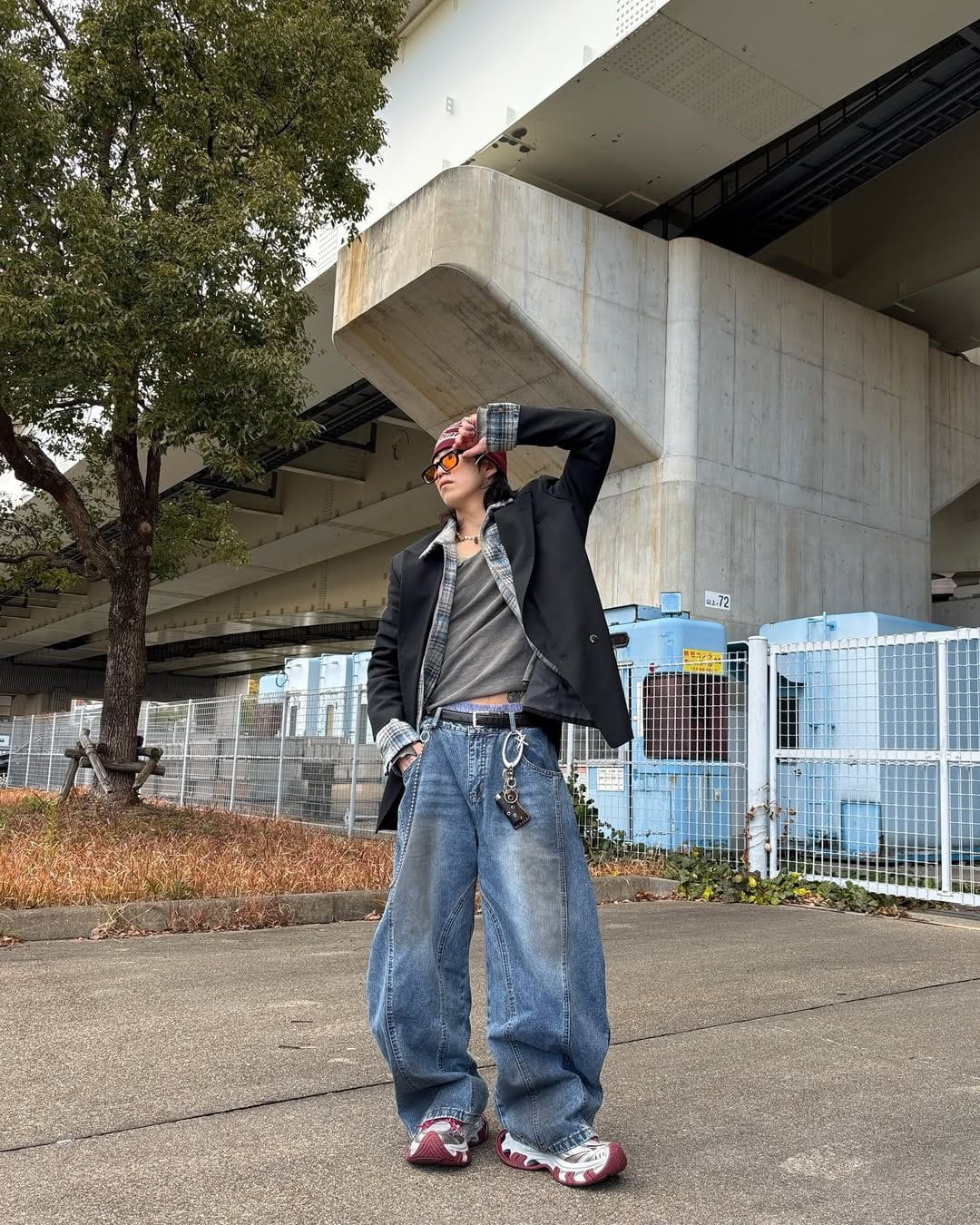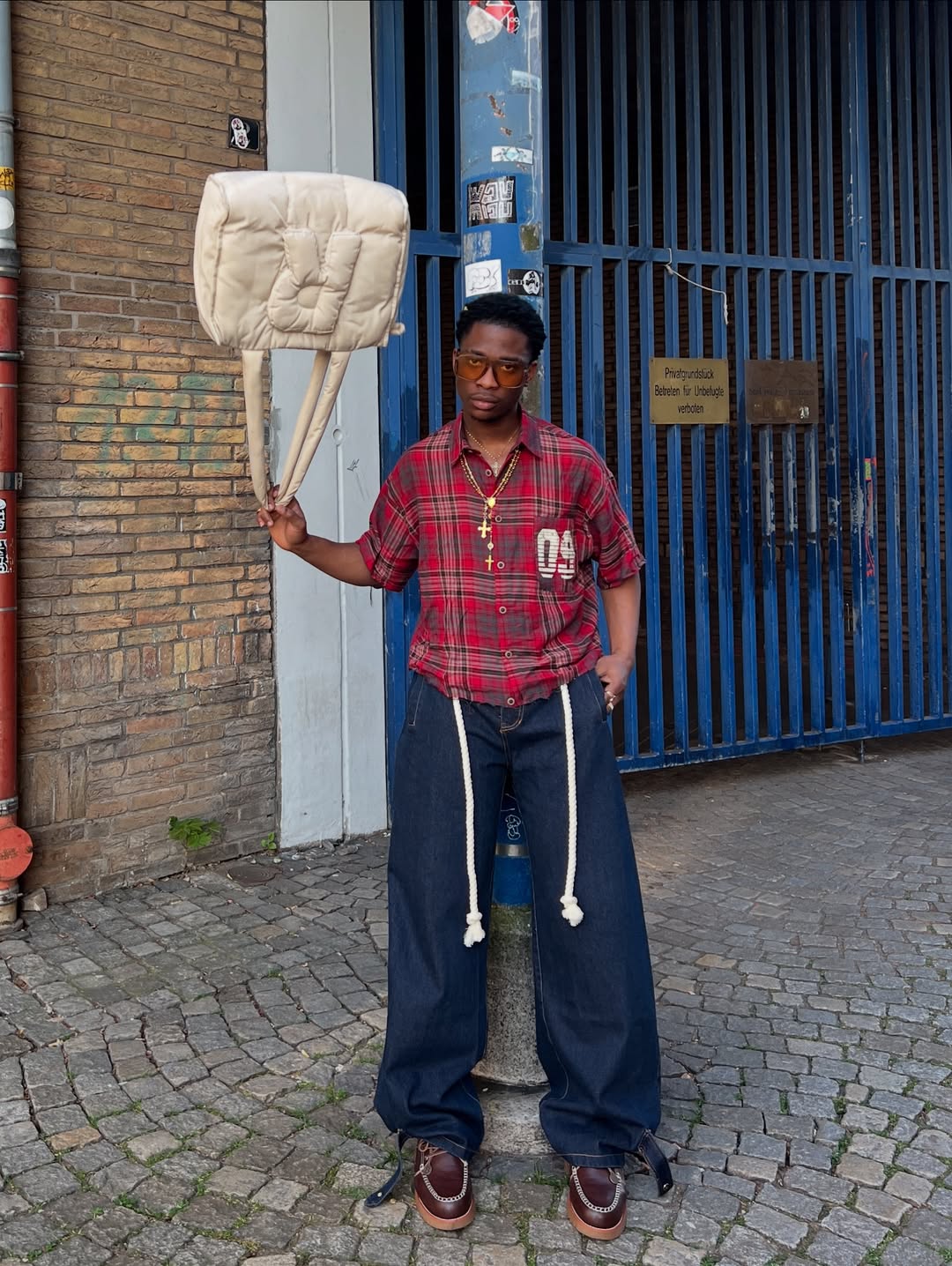 Description: These baggy-fit jeans feature a unique curved cut and a waistband-inspired hem detail at the cuffs, blending structure with creativity. The innovative design brings a fresh, fashion-forward twist to a classic silhouette. Paired with a red checkered Kerchief, it creates a striking look thatâs anything but ordinary.