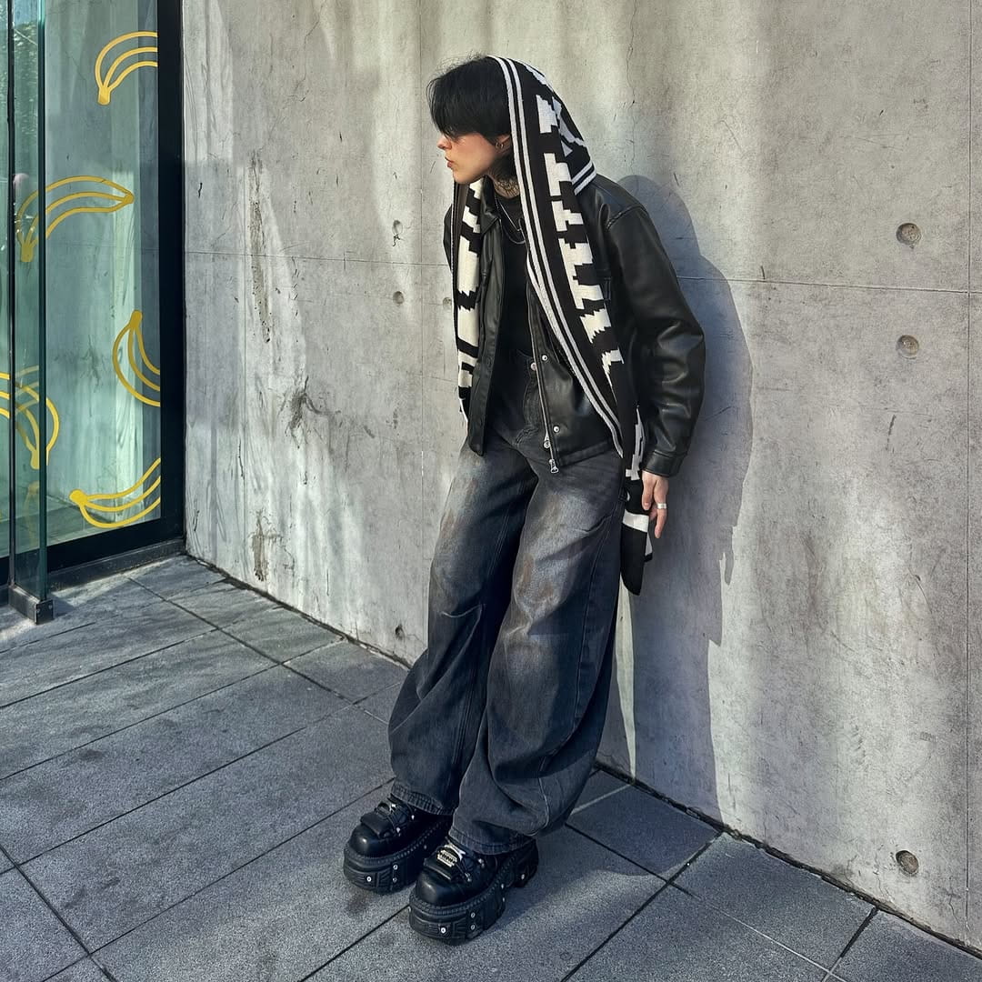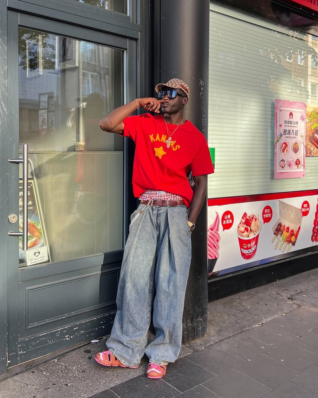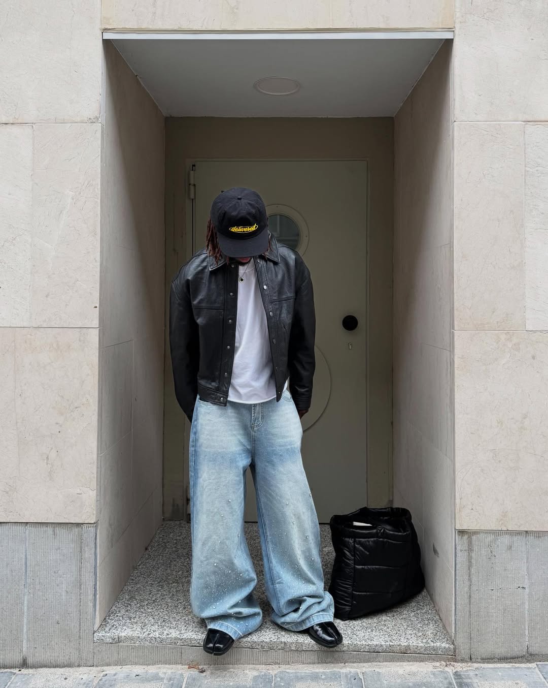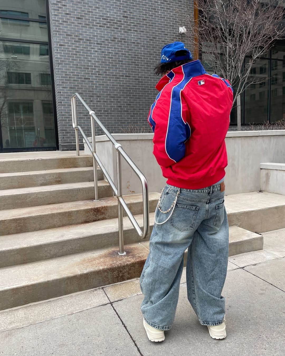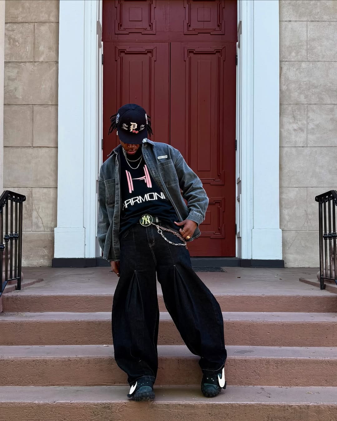 Description: These baggy-fit jeans feature a unique curved cut and a waistband-inspired hem detail at the cuffs, blending structure with creativity. The innovative design brings a fresh, fashion-forward twist to a classic silhouette. Paired with a red checkered Kerchief, it creates a striking look thatâs anything but ordinary.