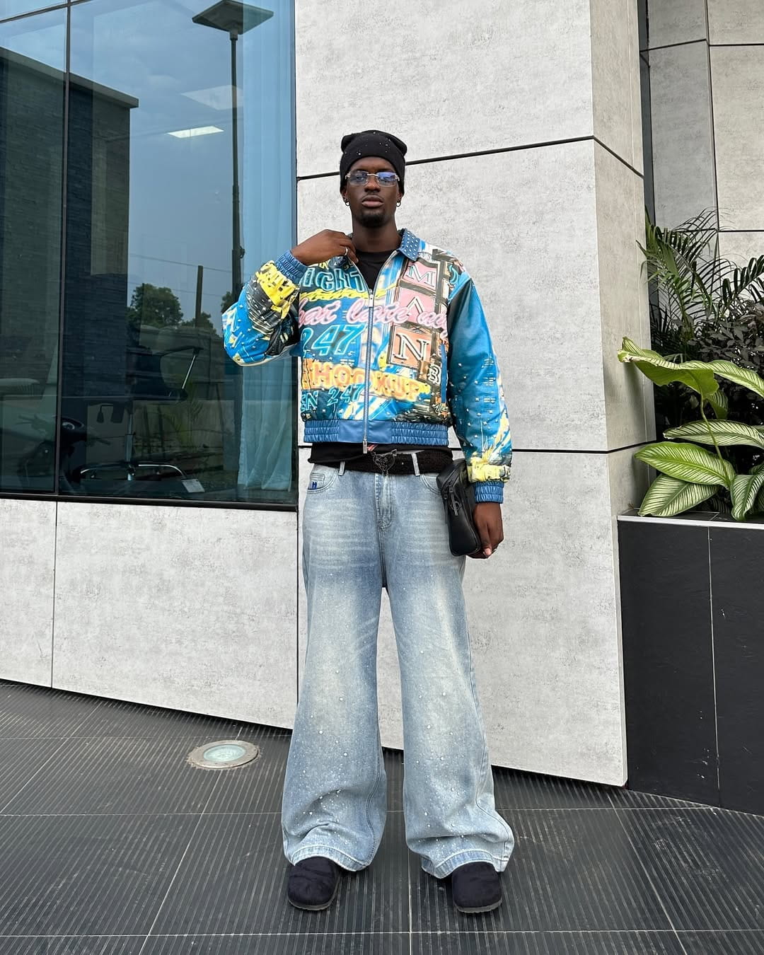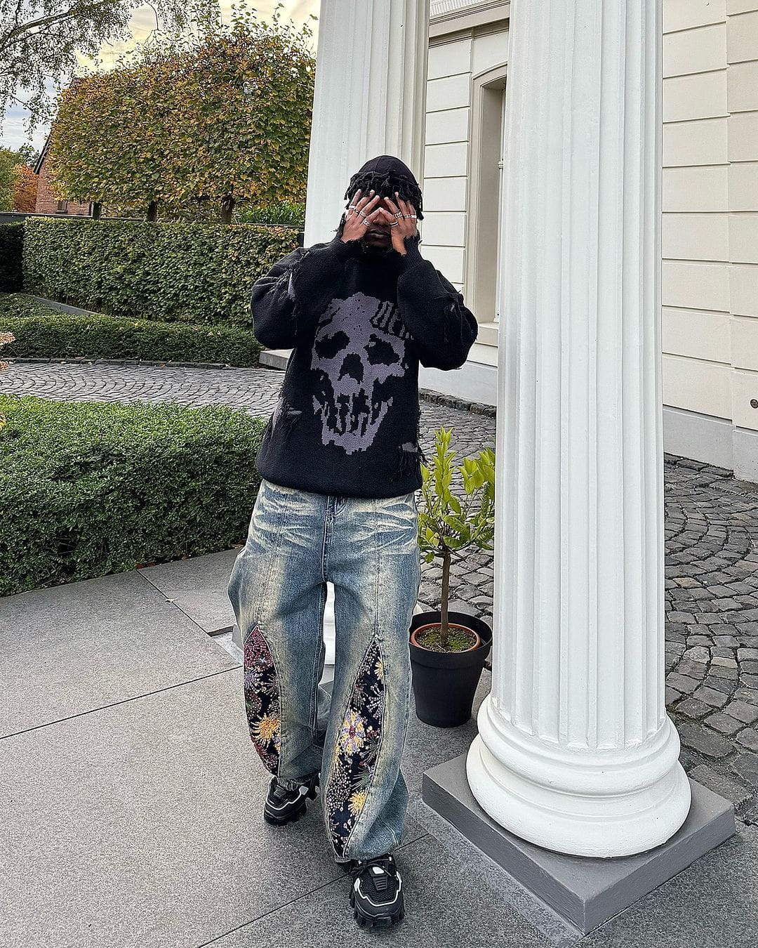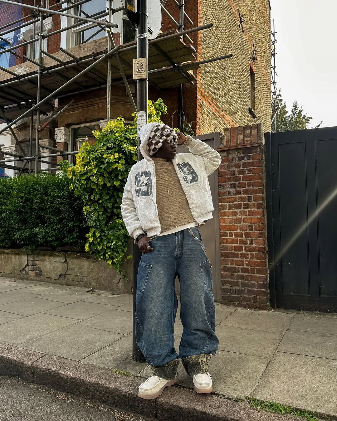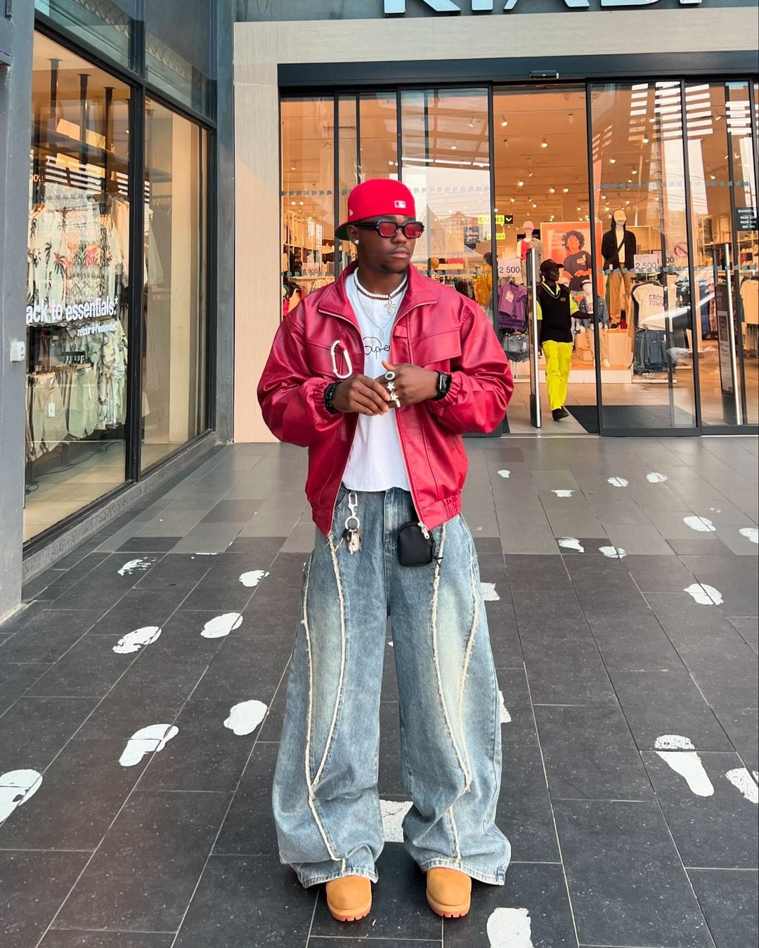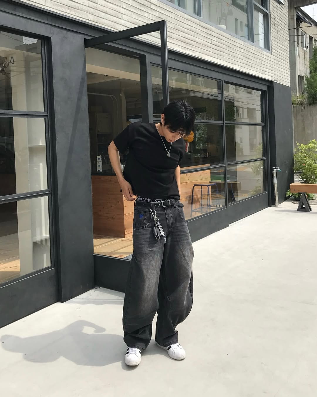 Description: These baggy-fit jeans feature a unique curved cut and a waistband-inspired hem detail at the cuffs, blending structure with creativity. The innovative design brings a fresh, fashion-forward twist to a classic silhouette. Paired with a red checkered Kerchief, it creates a striking look thatâs anything but ordinary.