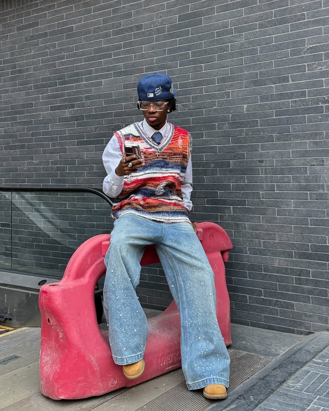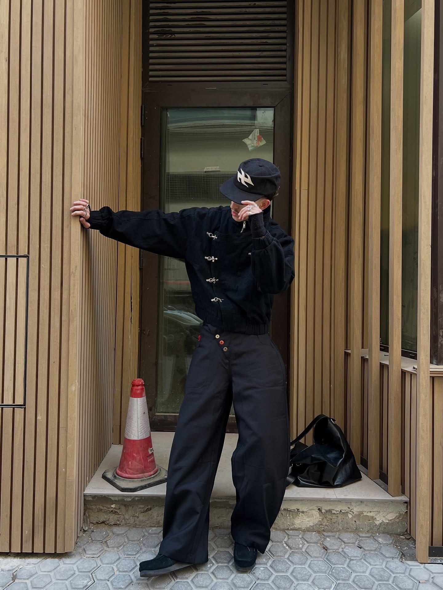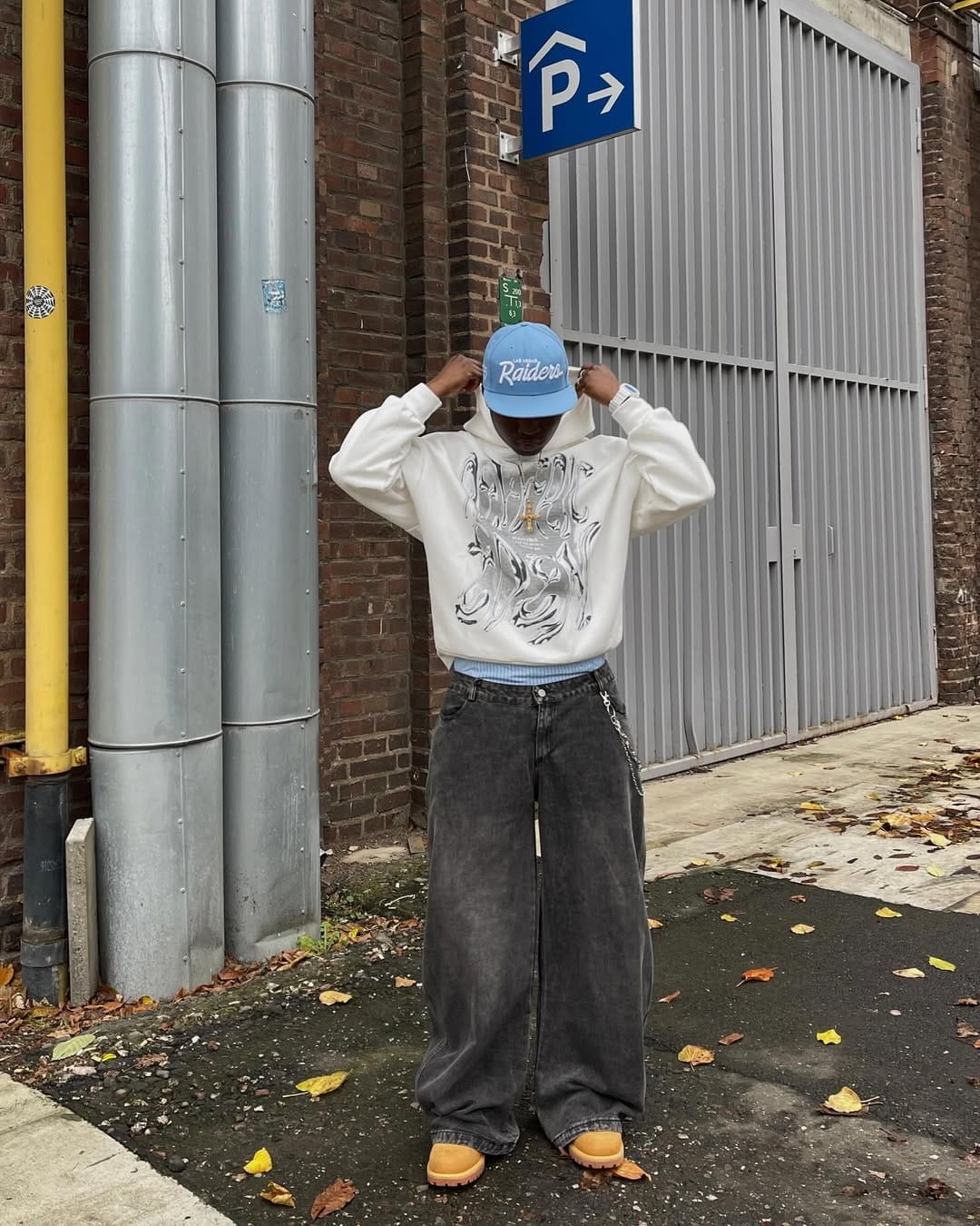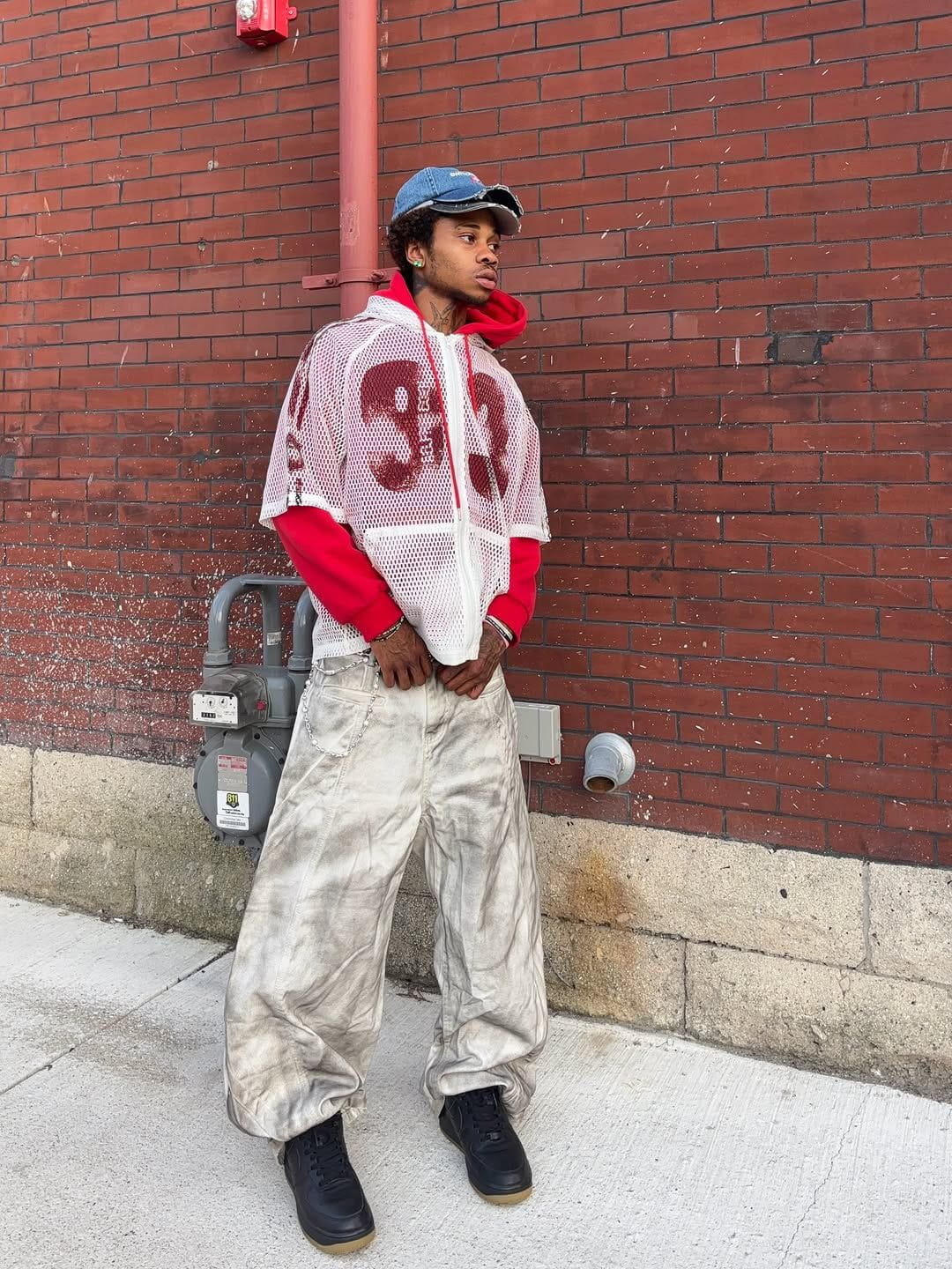Description: These baggy-fit jeans feature a unique curved cut and a waistband-inspired hem detail at the cuffs, blending structure with creativity. The innovative design brings a fresh, fashion-forward twist to a classic silhouette. Paired with a red checkered Kerchief, it creates a striking look thatâs anything but ordinary.