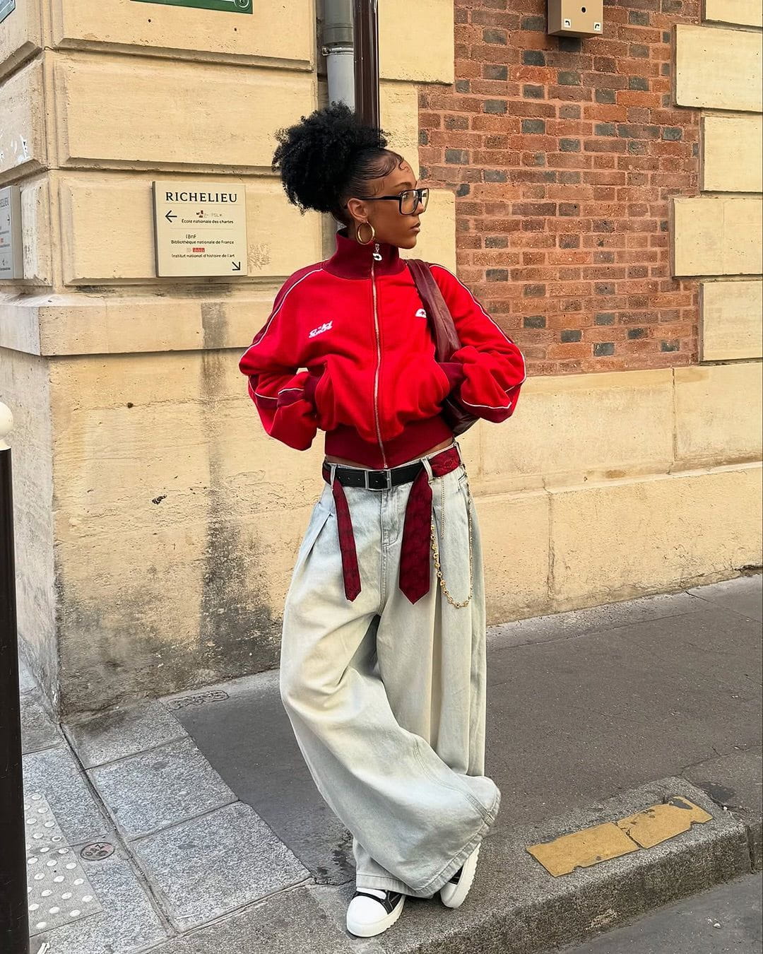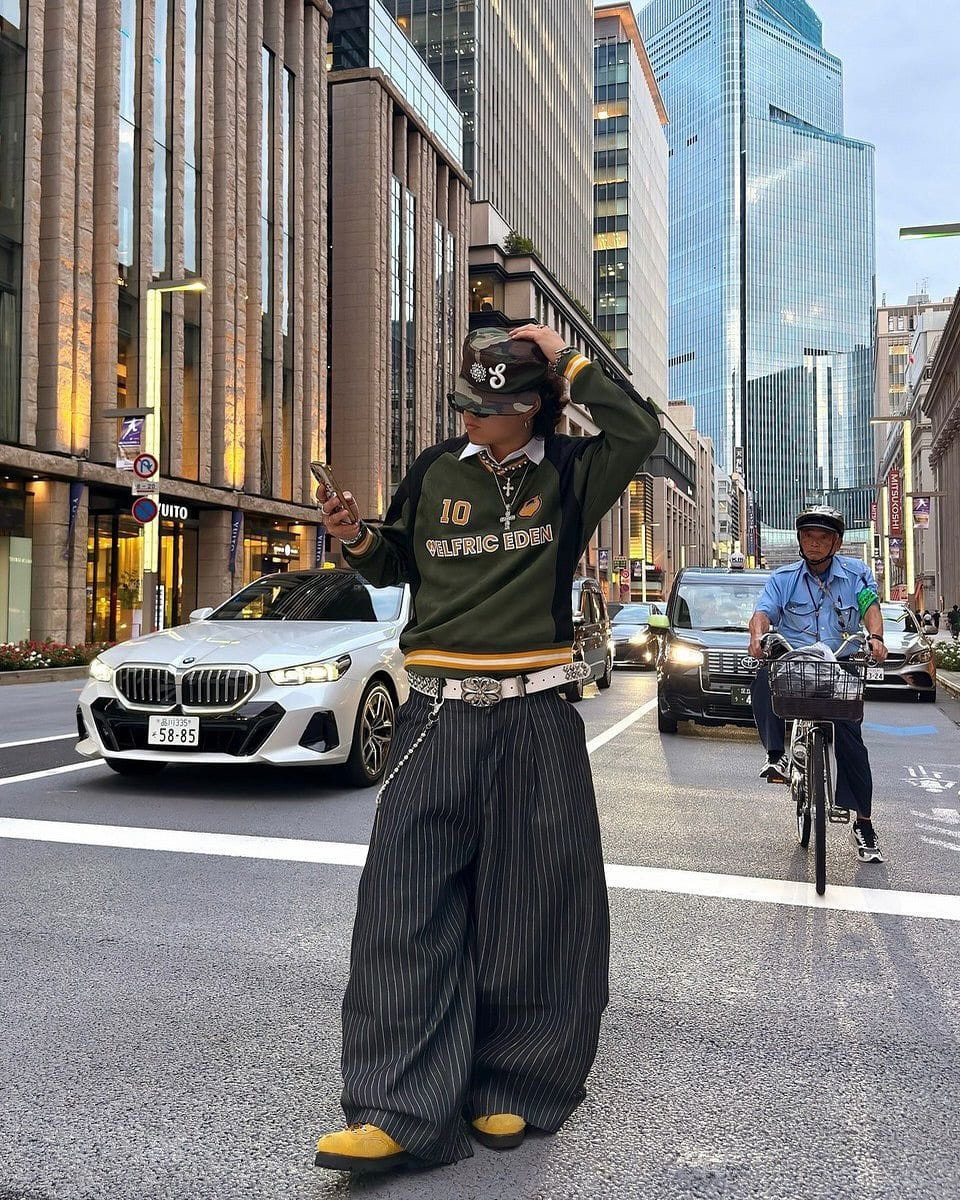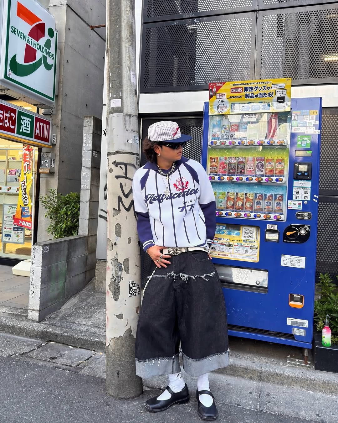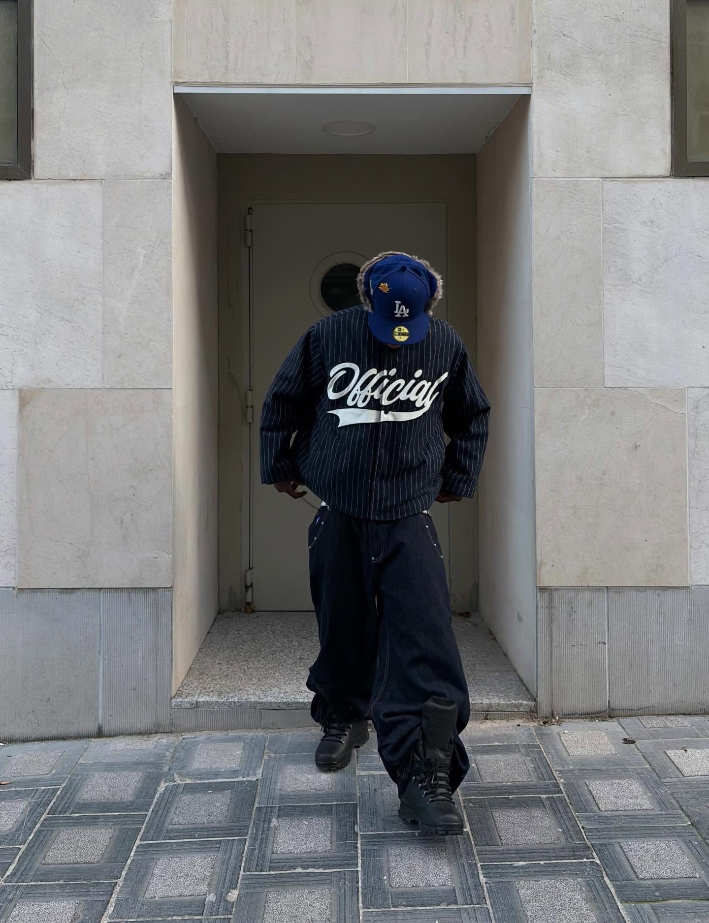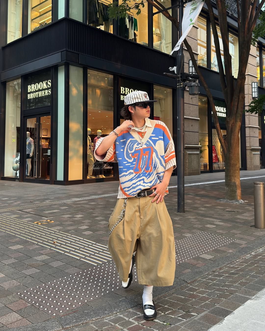 Description: These baggy-fit jeans feature a unique curved cut and a waistband-inspired hem detail at the cuffs, blending structure with creativity. The innovative design brings a fresh, fashion-forward twist to a classic silhouette. Paired with a red checkered Kerchief, it creates a striking look thatâs anything but ordinary.