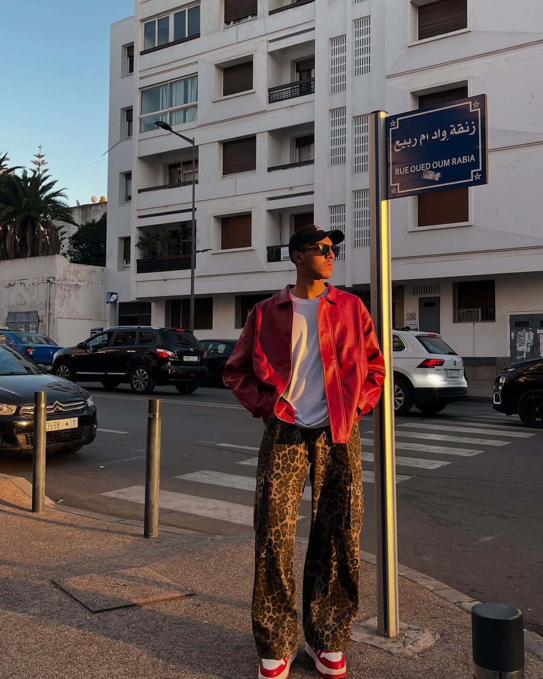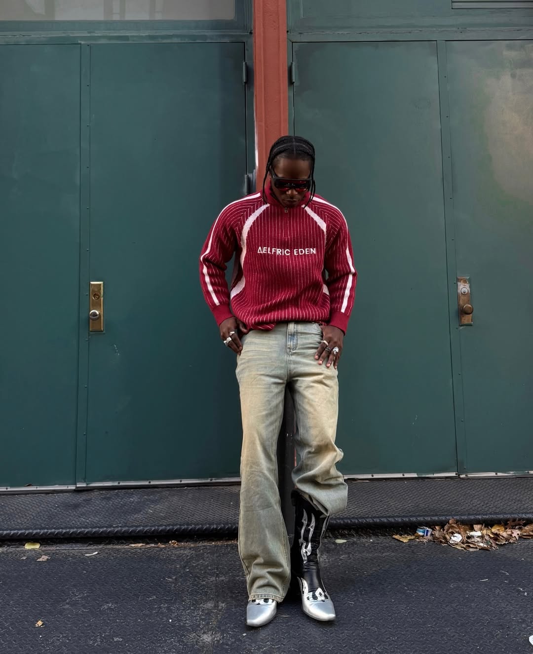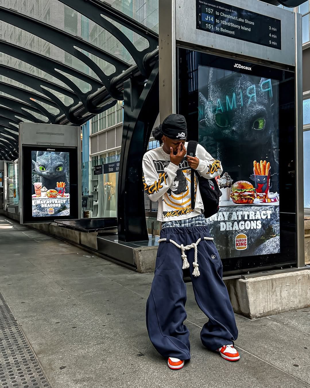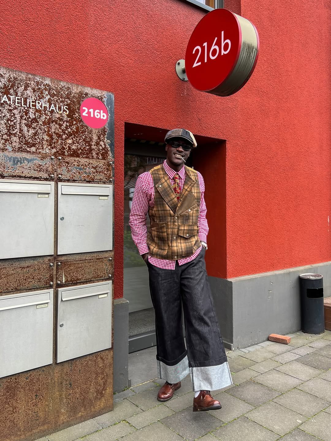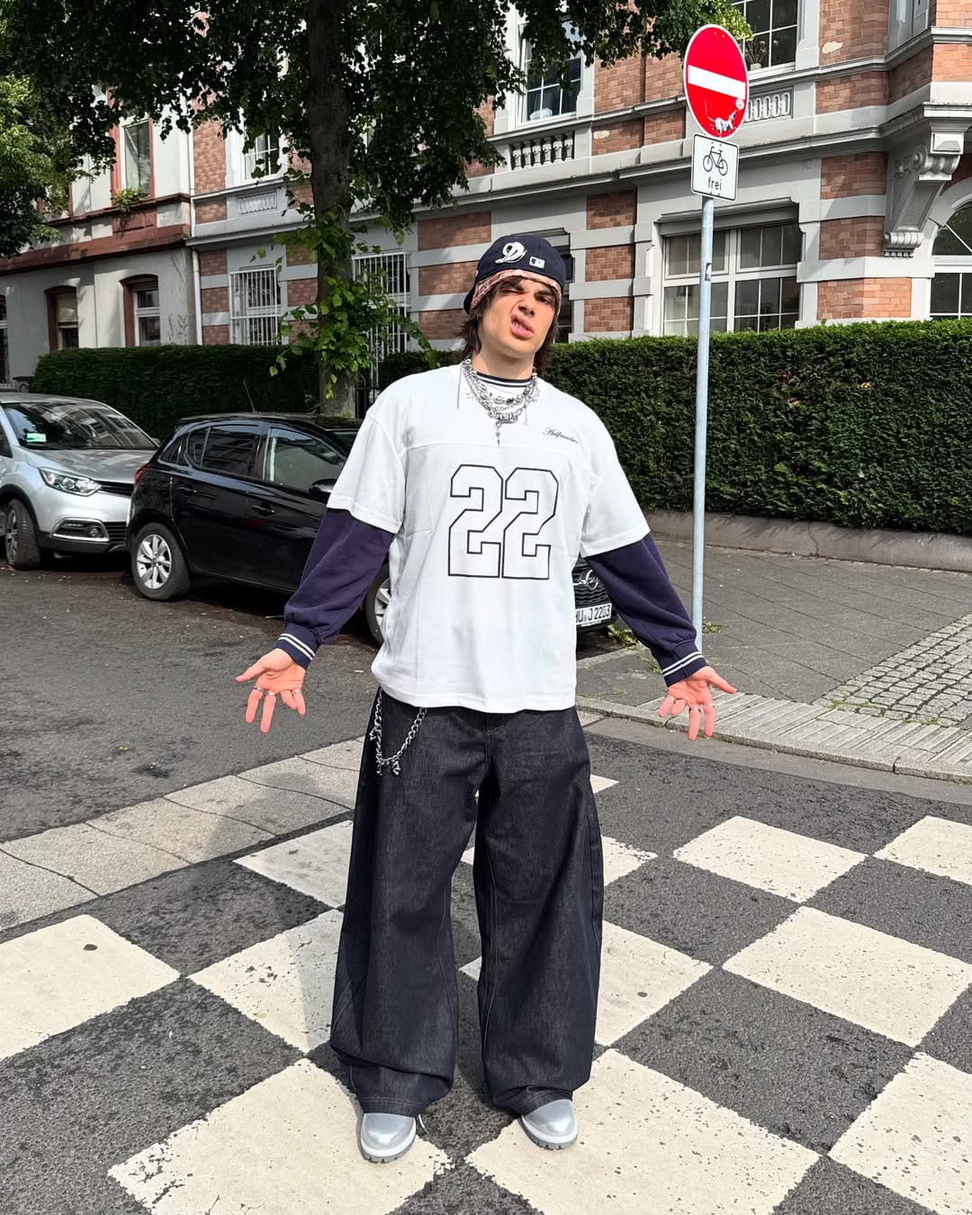 Description: These baggy-fit jeans feature a unique curved cut and a waistband-inspired hem detail at the cuffs, blending structure with creativity. The innovative design brings a fresh, fashion-forward twist to a classic silhouette. Paired with a red checkered Kerchief, it creates a striking look thatâs anything but ordinary.