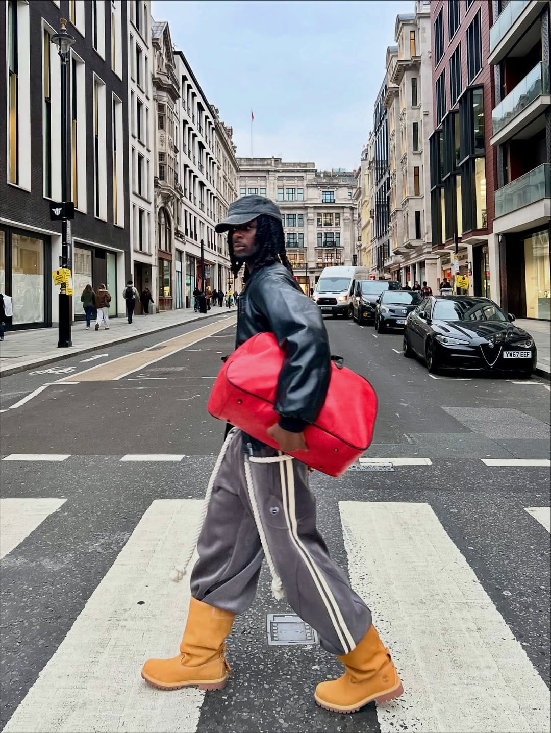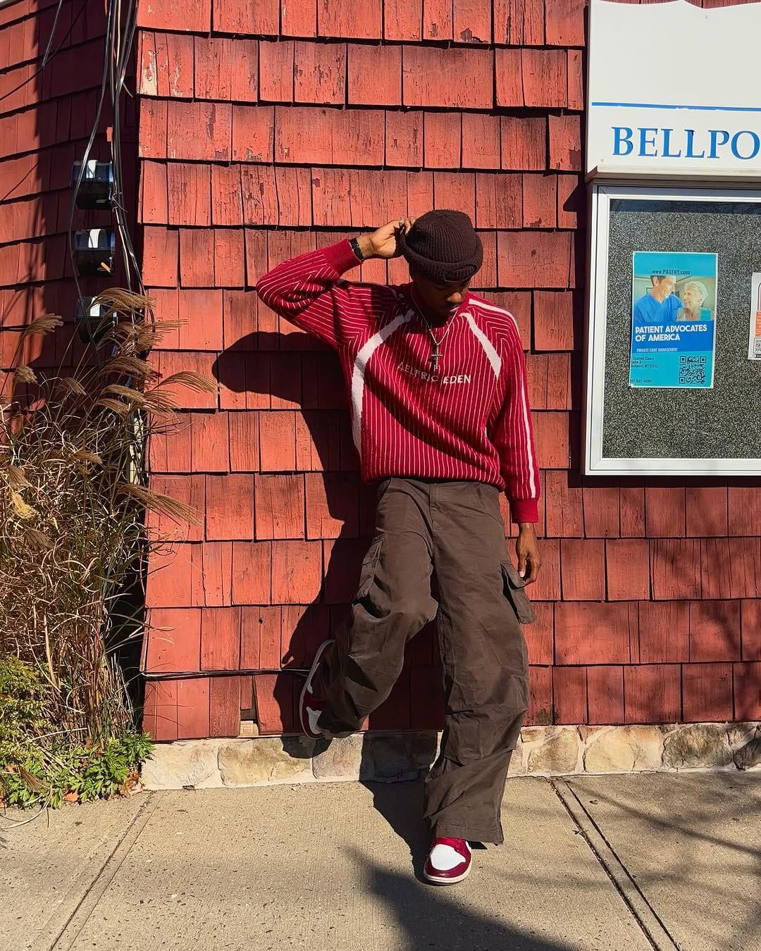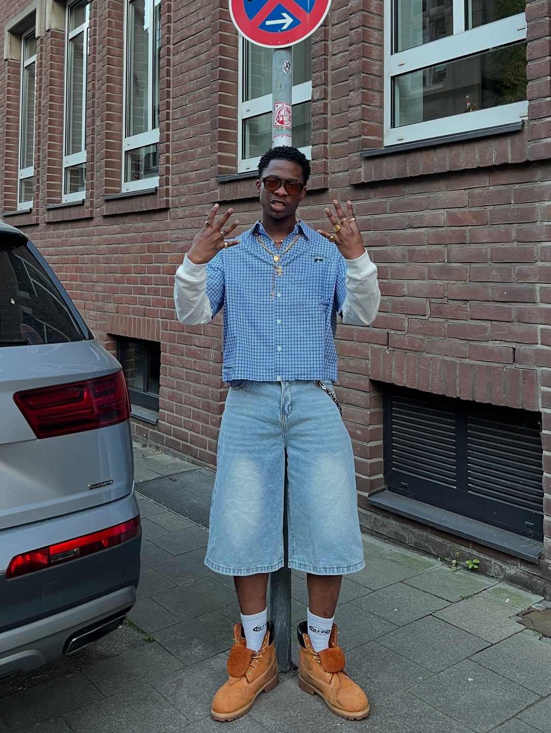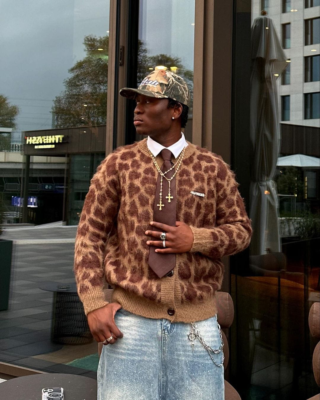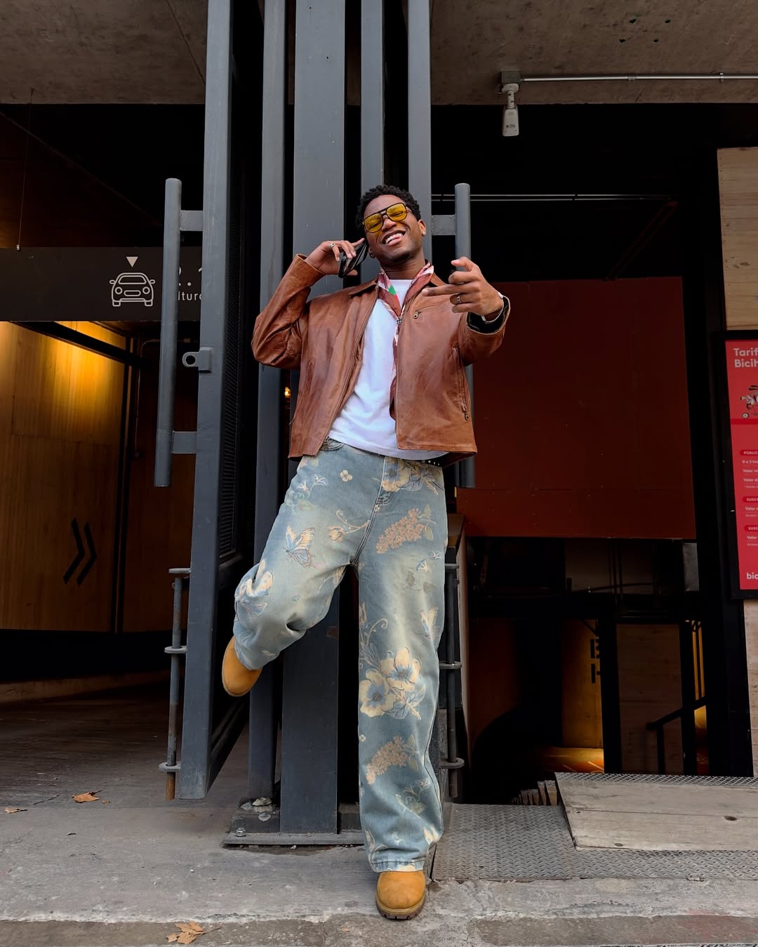 Description: These baggy-fit jeans feature a unique curved cut and a waistband-inspired hem detail at the cuffs, blending structure with creativity. The innovative design brings a fresh, fashion-forward twist to a classic silhouette. Paired with a red checkered Kerchief, it creates a striking look thatâs anything but ordinary.