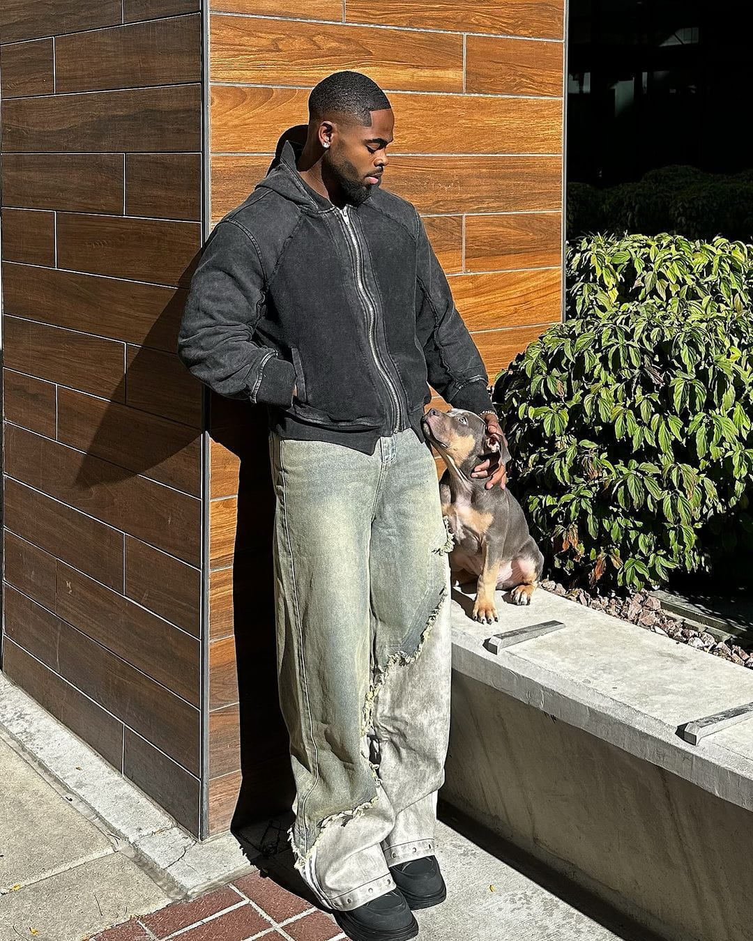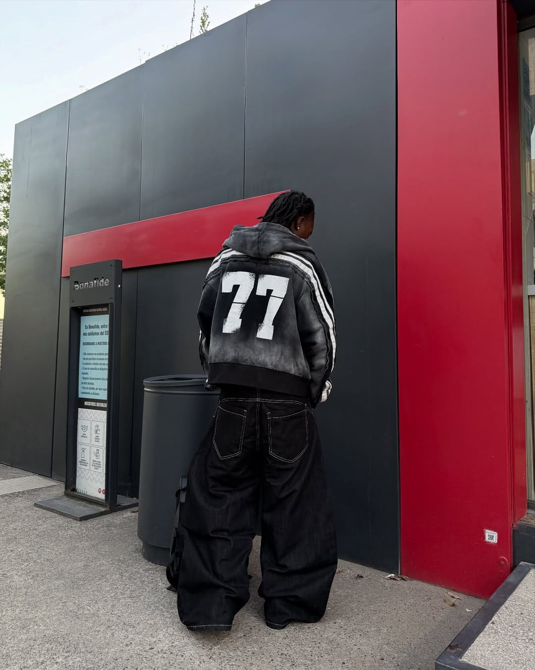 Description: Crafted in a bold black acid-wash finish, this statement zip-up features dual zipper closure, varsity-style badge logos, and contrasting athletic stripes down both sleeves. The structured hood brings a retro-sport meets street-ready aesthetic.
