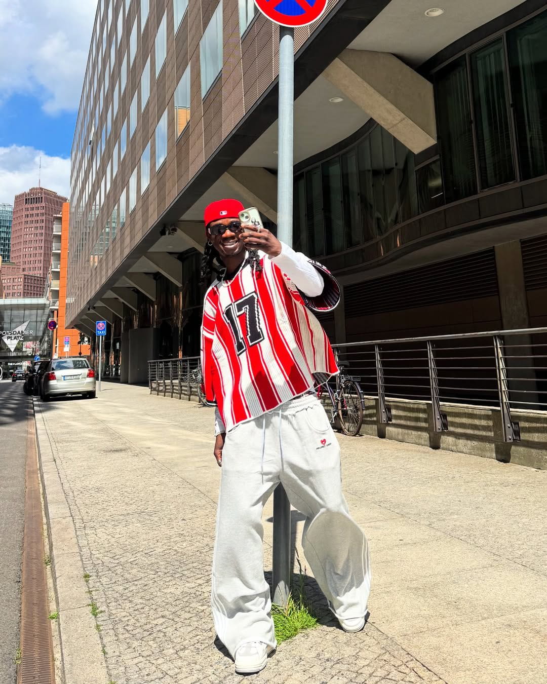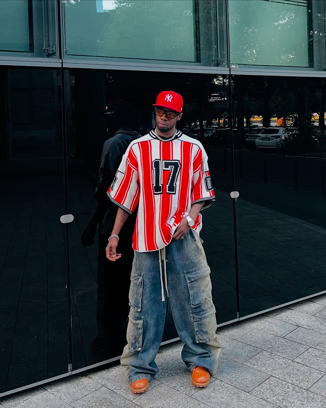 Description: A statement knit tee with bold red and white stripes, accented by navy details. Features oversized varsity-inspired "17" and sleeve graphics for a sporty aesthetic. Made from soft, textured knit fabric, it combines comfort and eye-catching style.