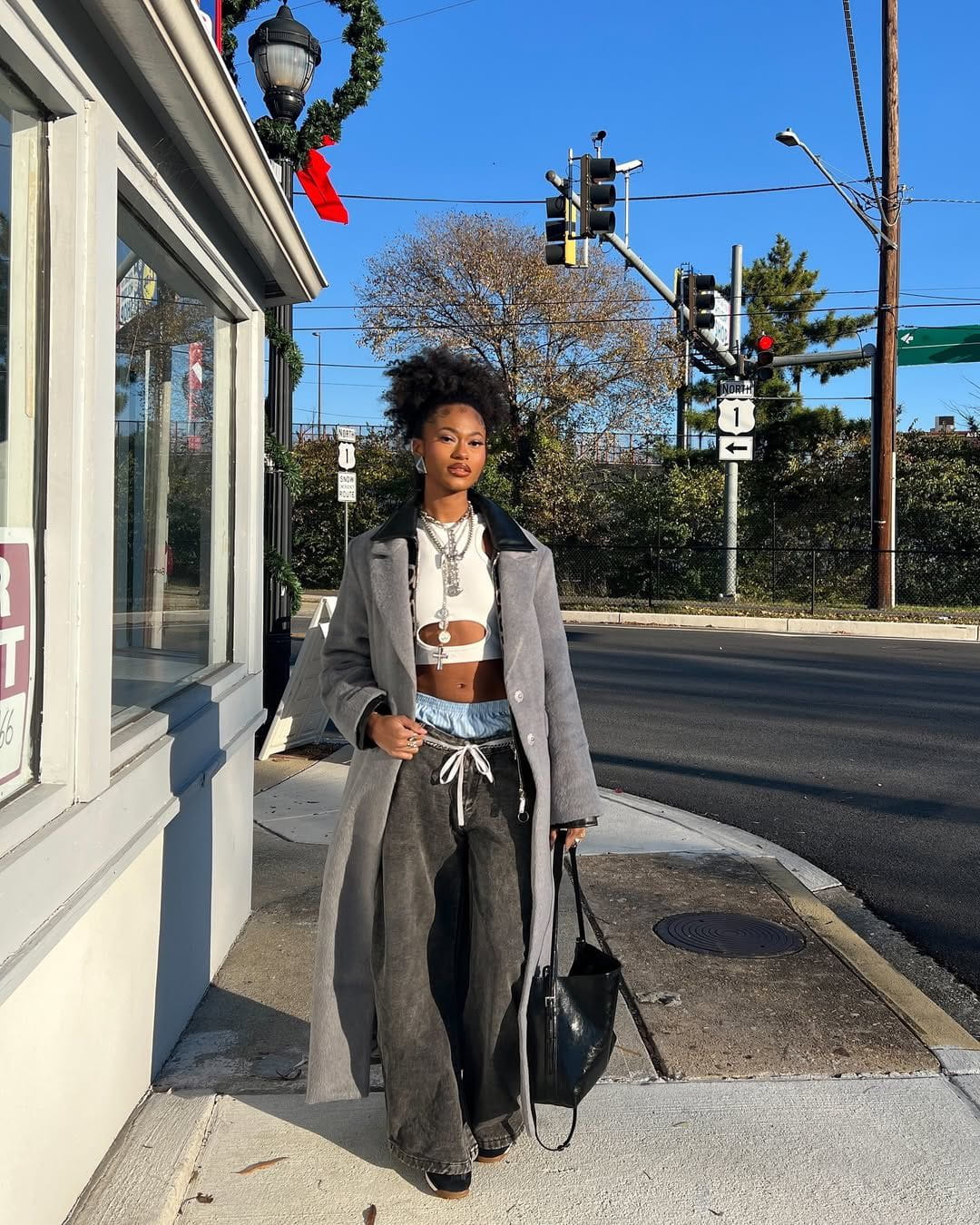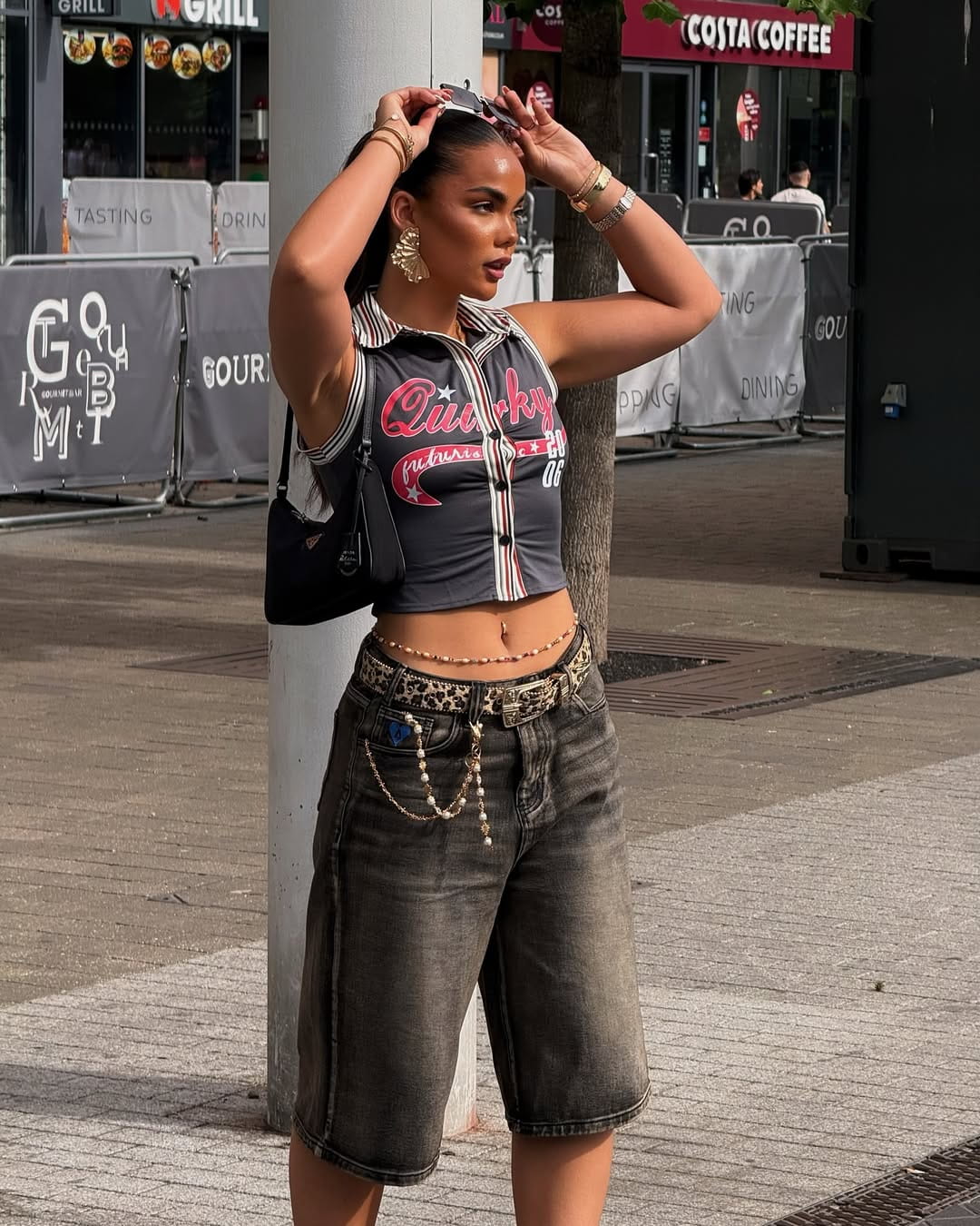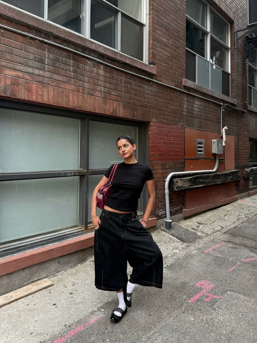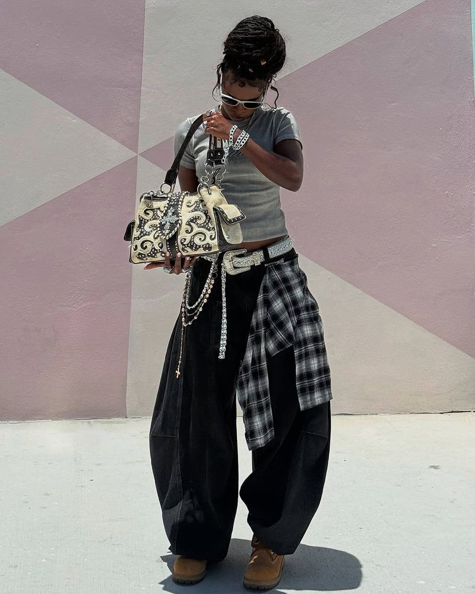 Description: Plaid fabric is cleverly draped across the waist, creating a layered shirt-around-the-hip effect. These super baggy black jeans blend grunge elements with streetwear volume, offering a bold, deconstructed silhouette from every angle.