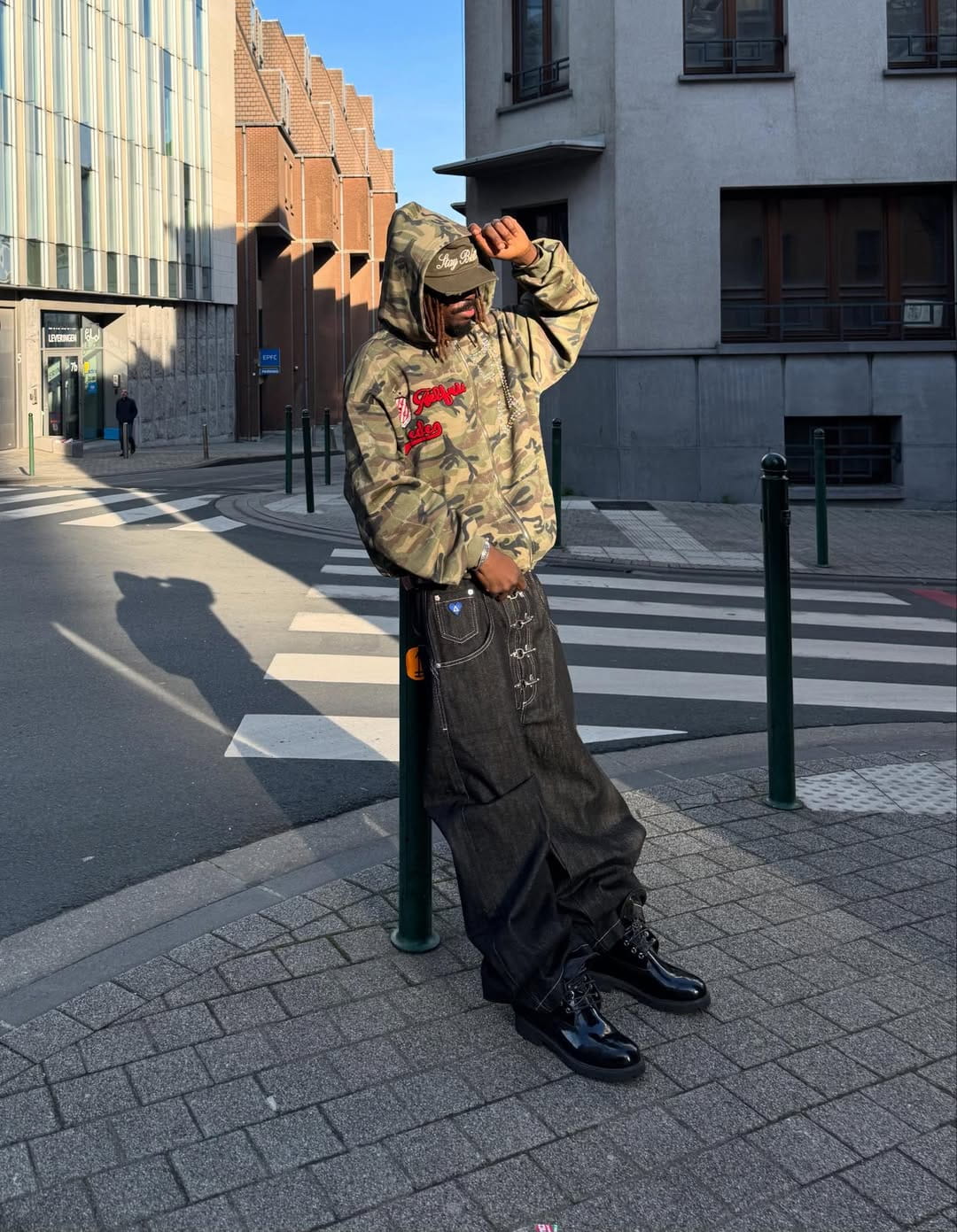 Description: Blending classic street culture with bold camouflage, these pants redefine urban style. The signature curved cut adds a sleek, modern edge, elevating the rugged aesthetic. Tough yet refined, theyâre made to stand out. Gear up and own the streets.