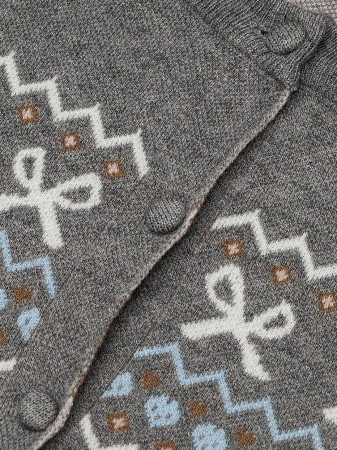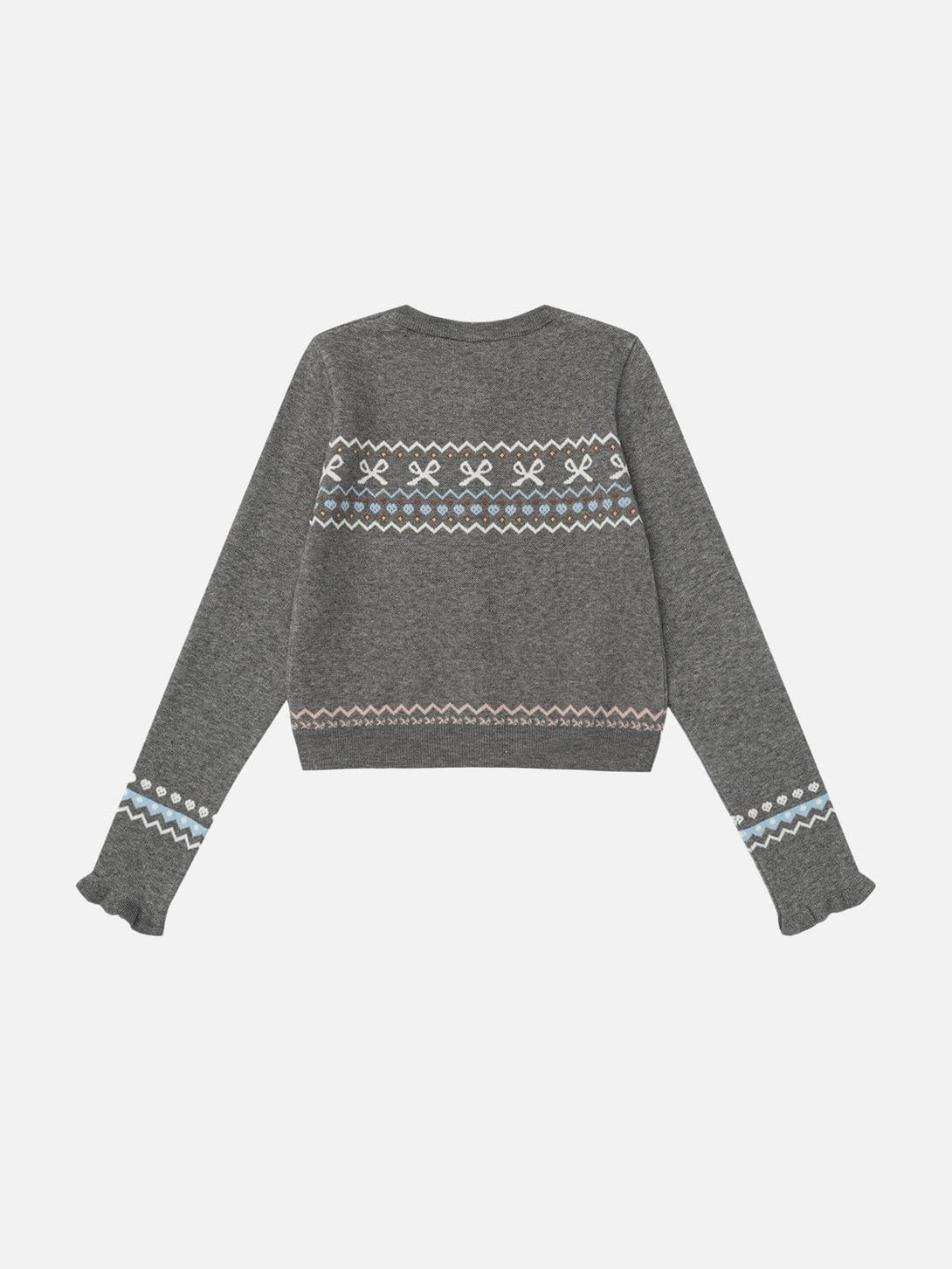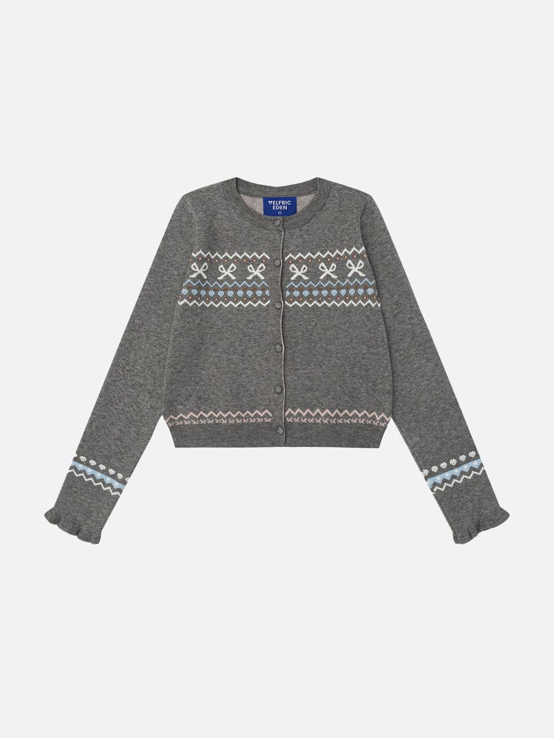 Aelfric Eden Fair Isle Cropped Cardigan showcases a delicate Fair Isle knit pattern accented with charming bow details, blending a cozy vintage vibe with a playful, feminine touch.