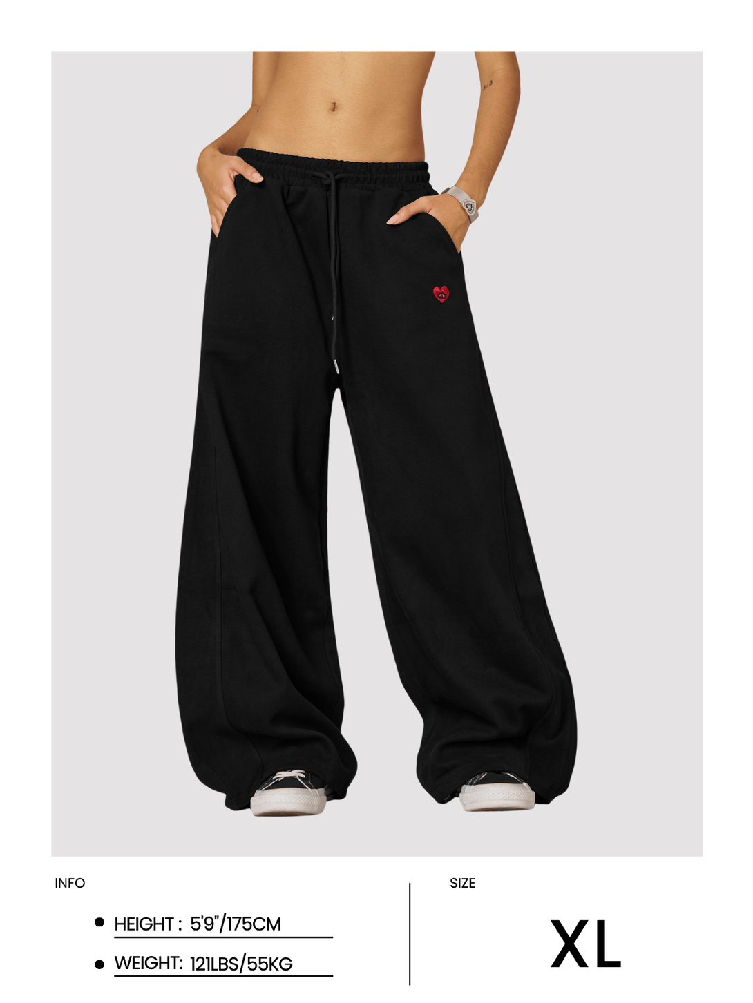 A statement in silhouette, these sweatpants redefine casual with a dramatically wide barrel cut. Clean lines and a deep black (Khaki) hue give them a sharp, modern edge. Finished with a subtle red (grey) heart emblem, they blend softness and structure with understated attitude.