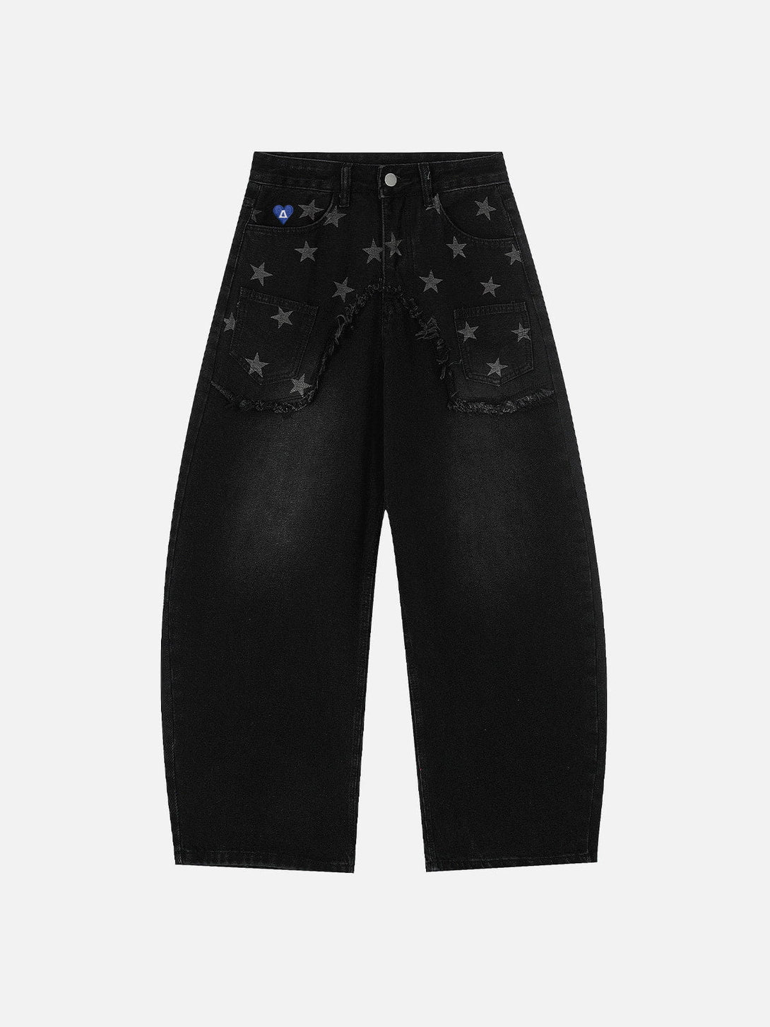 Stand out in street style with these baggy jeans, featuring bold star embroidery and camouflage patchwork that blend rugged texture with urban flair. Crafted from durable washed denim, they offer a relaxed fit and easy movement.
