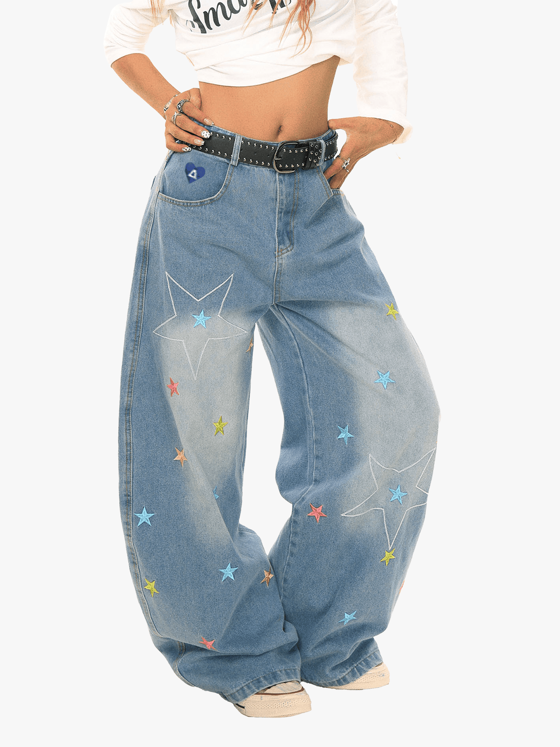These jeans add playful energy to classic streetwear denim. Featuring vibrant stars embroidery across a loose barrel-leg silhouette, these jeans bring bold character and relaxed comfort. Made from a durable cotton blend, they’re perfect for creative layering and making a standout everyday fit, a fun statement piece for fashion-forward youth.