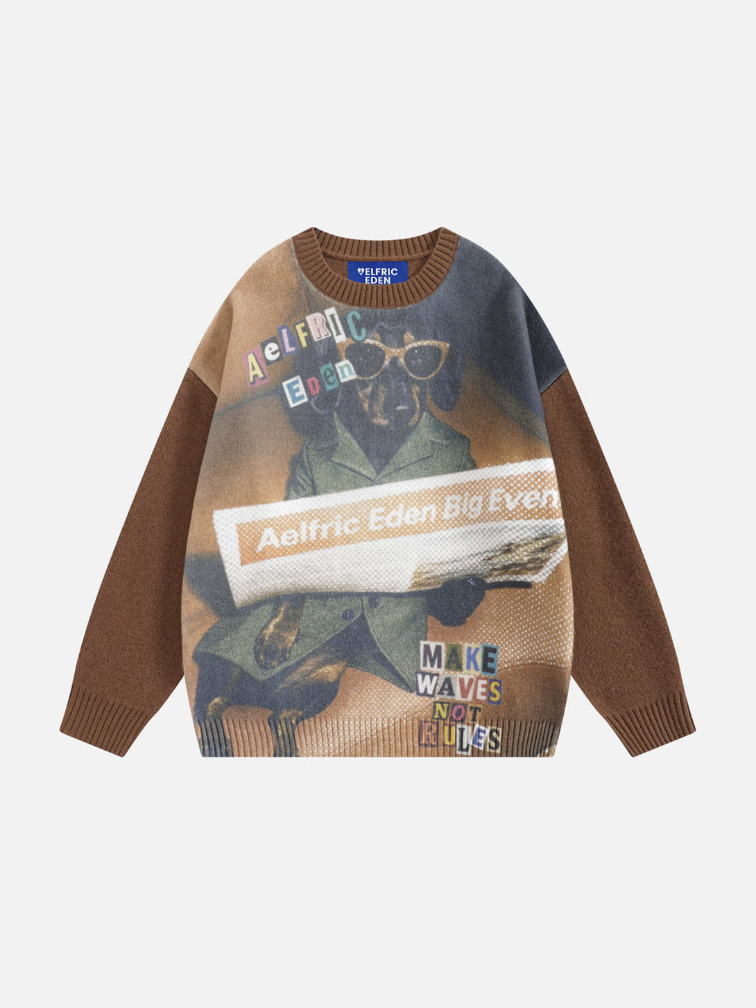 A bold dachshund graphic brings a playful edge to this cozy knit, mixing retro poster vibes with a clean, easy-to-wear silhouette. Soft yarn keeps it comfortable, while the mixed typography adds attitude without trying. A statement piece that instantly lifts any casual look.