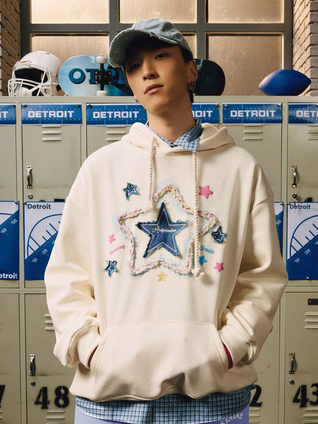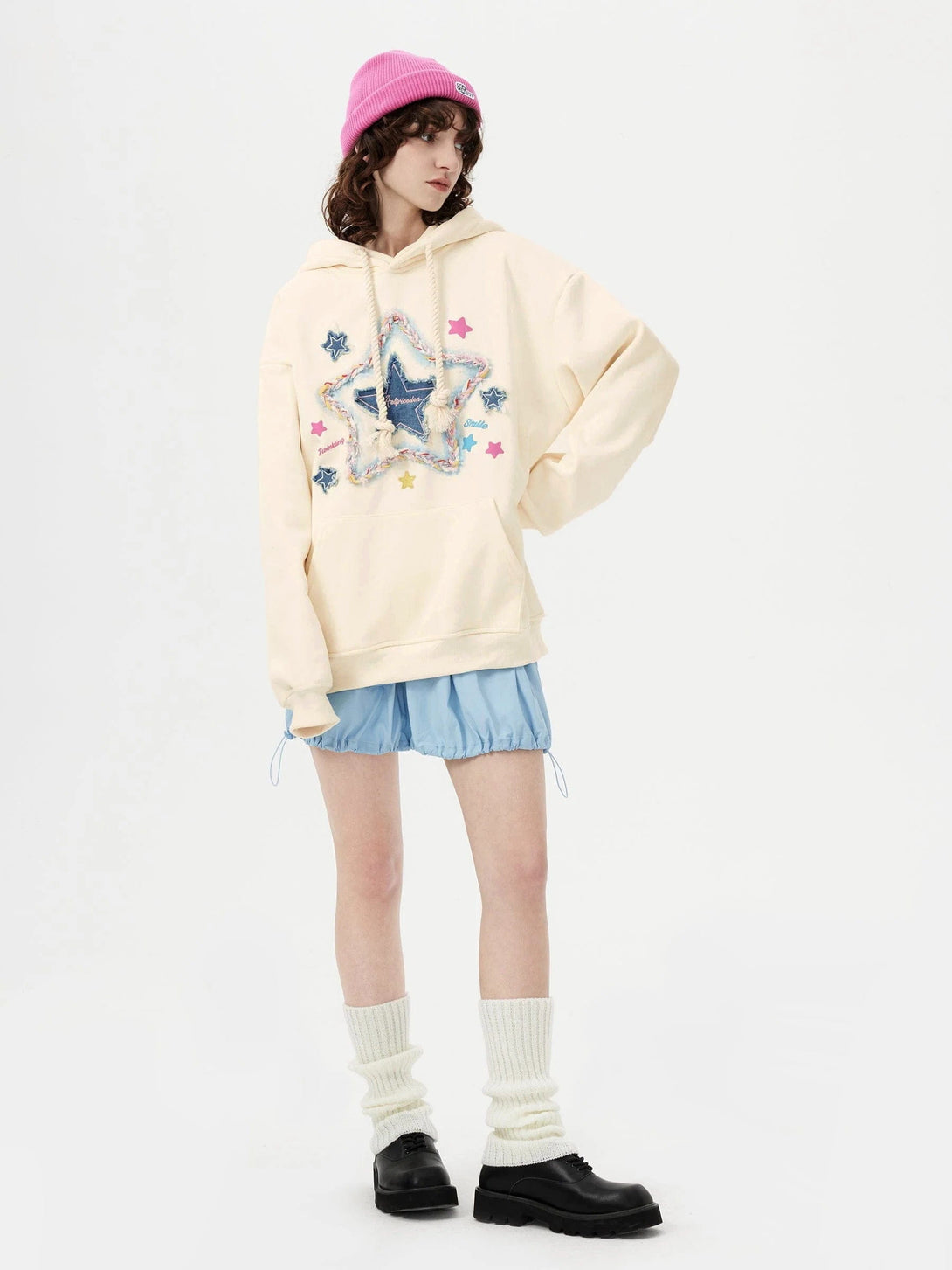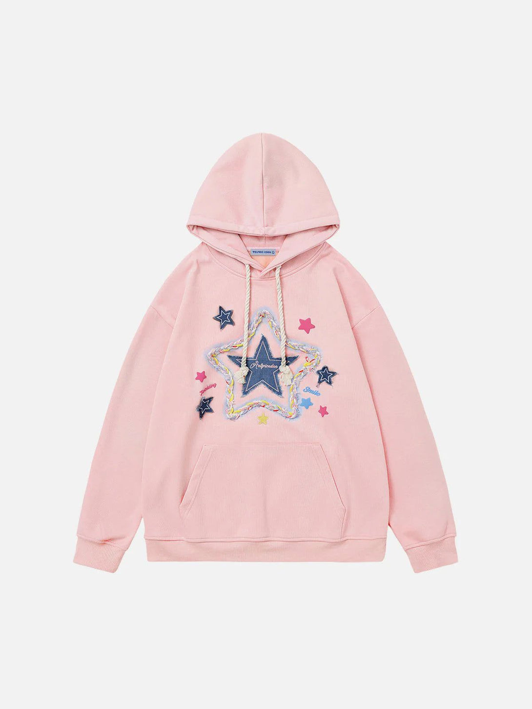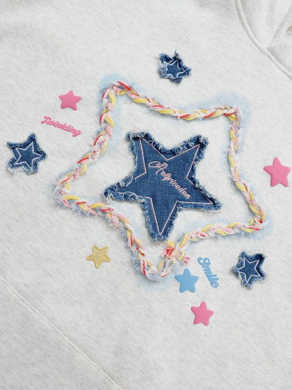Unveil casual charm with our hoodie, showcasing a central canvas star embellished with vibrant cords, forming a stellar silhouette. Complemented by petite pentagrams, it radiates playful elegance.