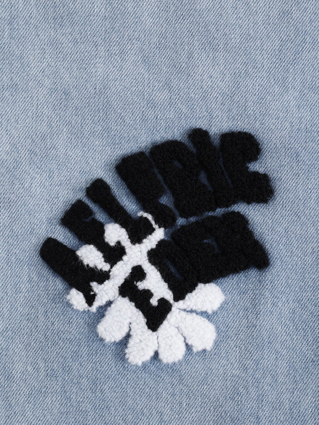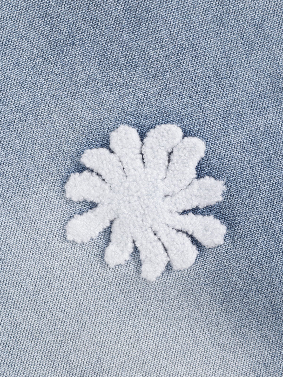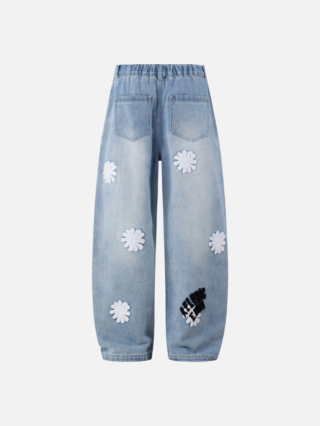 Soft-wash denim meets playful texture with tufted flower patches popping across a roomy baggy silhouette. The contrast blooms add a fun, lifted feel to the jeans, giving everyday fits an easy statement twist.