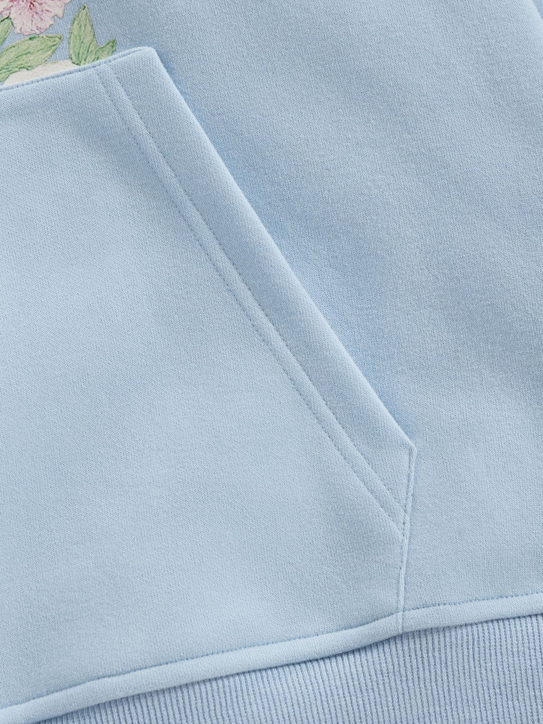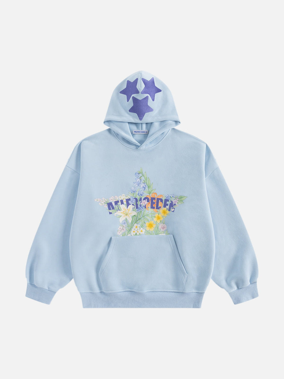 Soft color meets whimsical charm in this pullover hoodie, featuring vibrant floral graphics intertwined with bold lettering. Three playful purple stars crown the hood, adding a pop of contrast. A cozy, artistic layer that balances comfort and creativity.