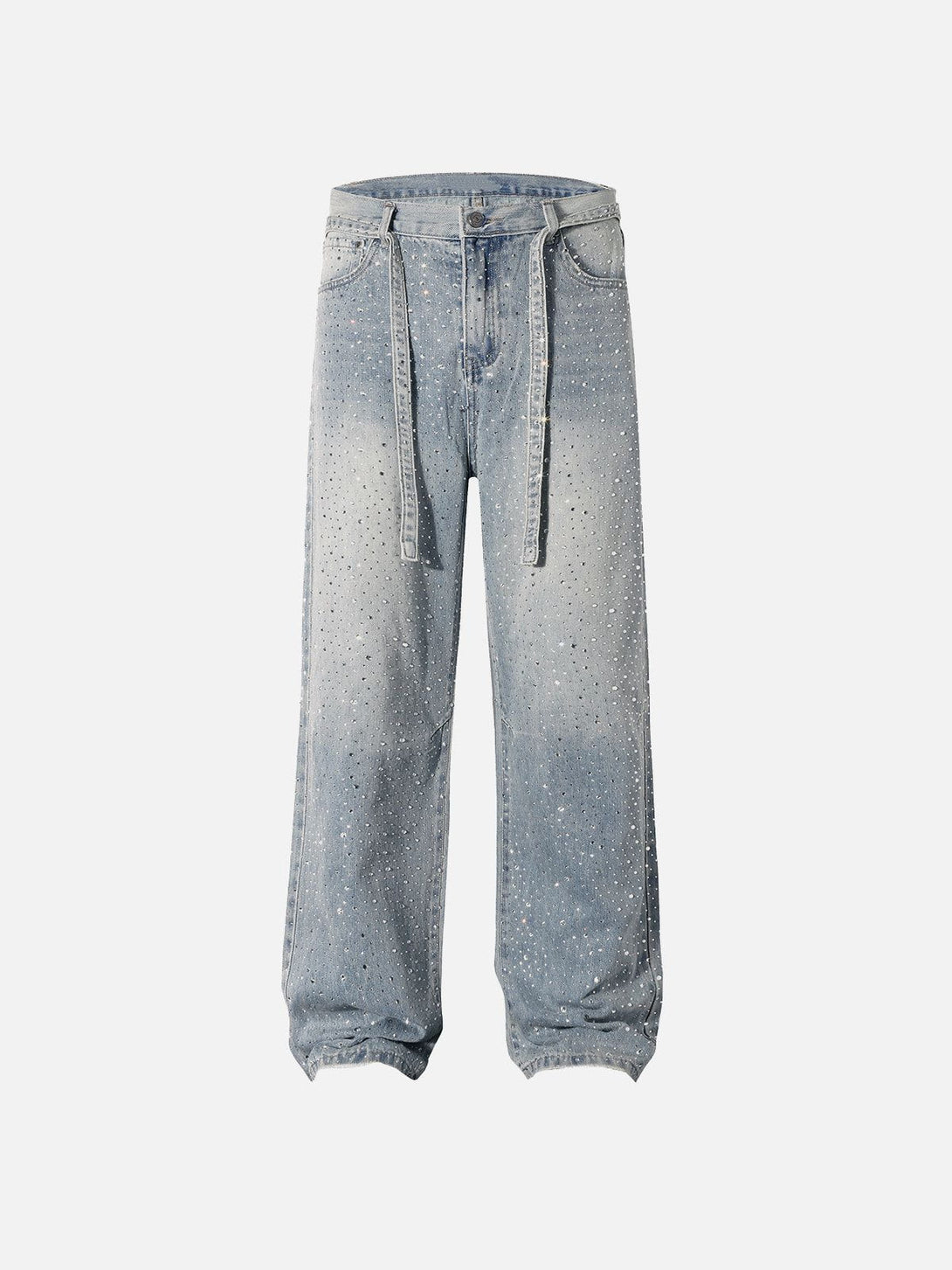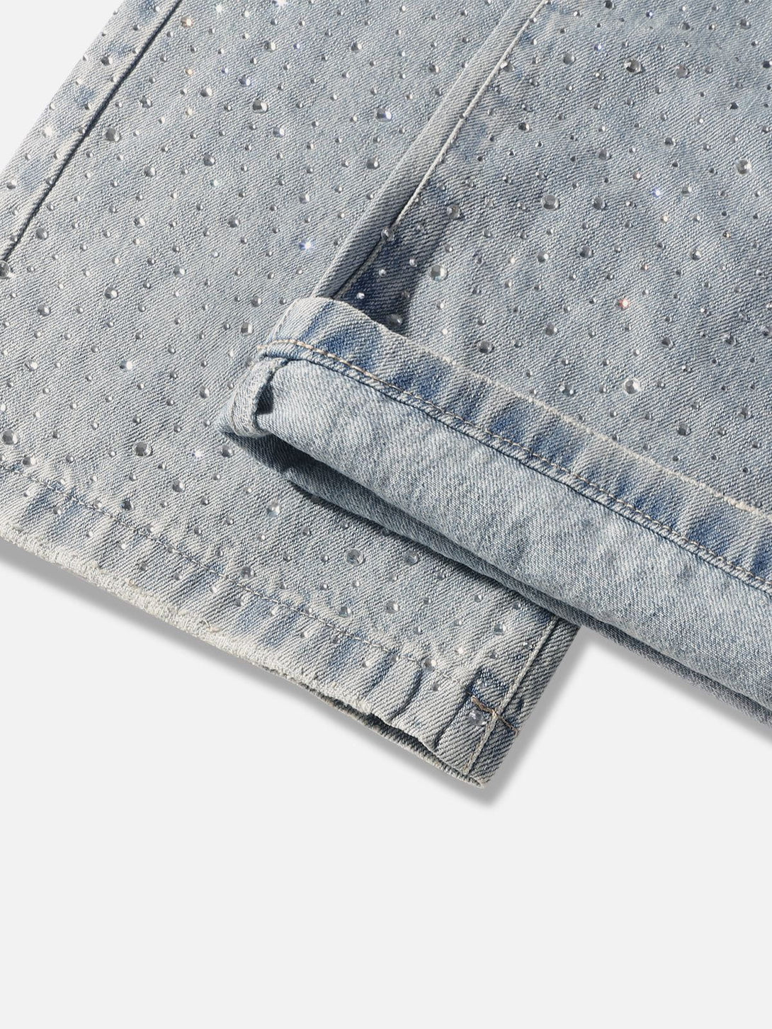 These jeans combine classic denim with a touch of glam, featuring eye-catching rhinestone embellishments that elevate their style. The baggy fit and unique detailing make them perfect for adding a bit of sparkle to your casual outfits. Dress them up or down for a versatile look that's both trendy and chic.