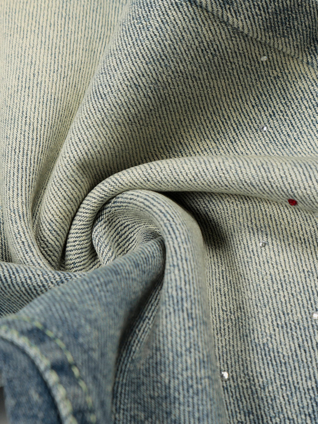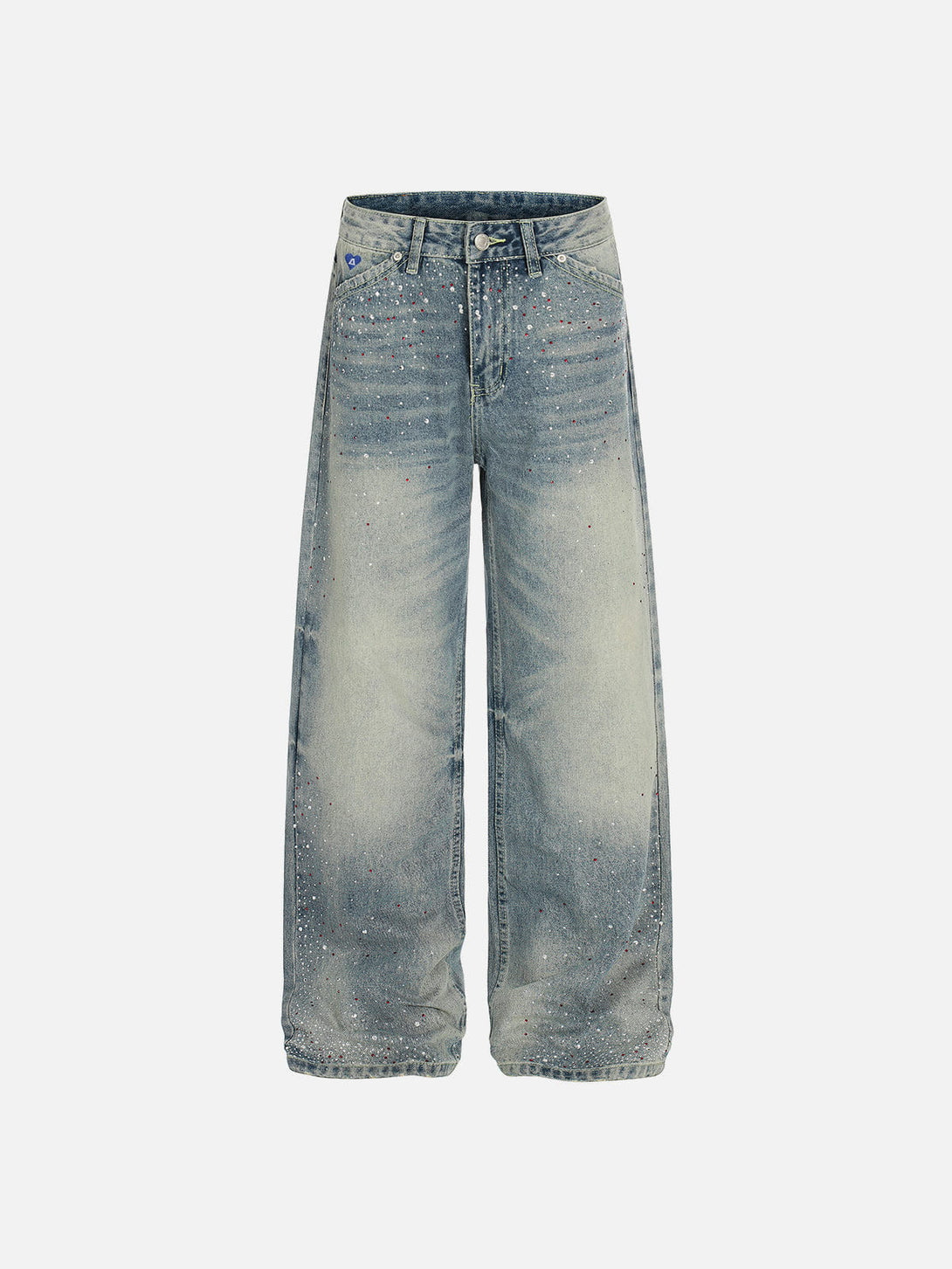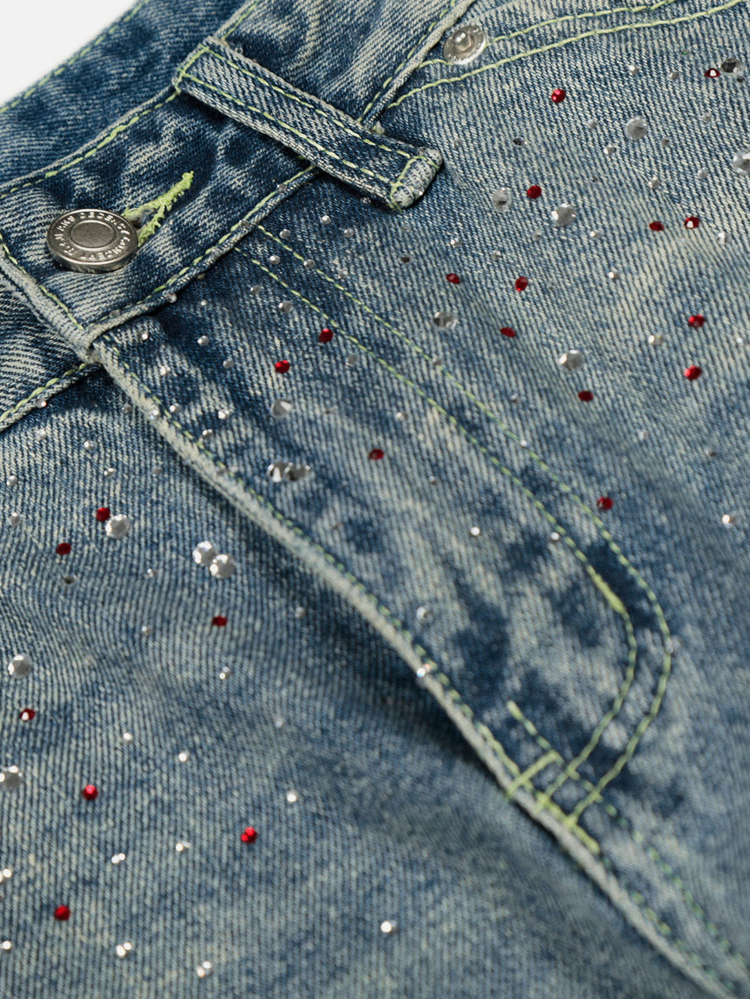 The Aelfric Eden Rhinestone Jeans bring sparkle and edge to a classic denim silhouette. The soft washed finish gives them a lived-in, vintage texture, while scattered rhinestones add a bright, standout shimmer. Comfortable, eye-catching, and easy to styleโperfect for lifting everyday outfits with a touch of shine.
